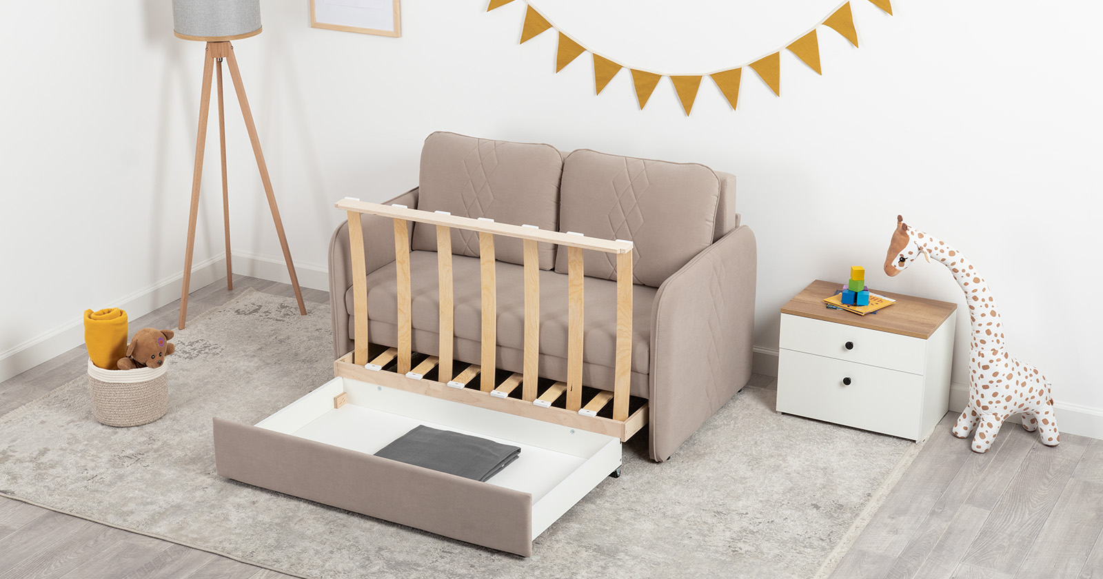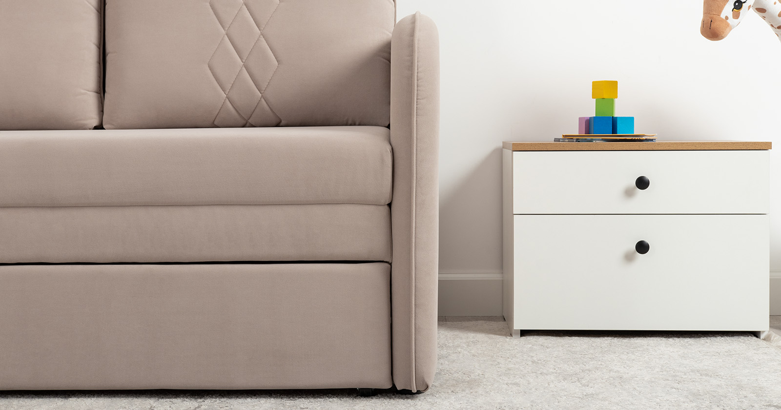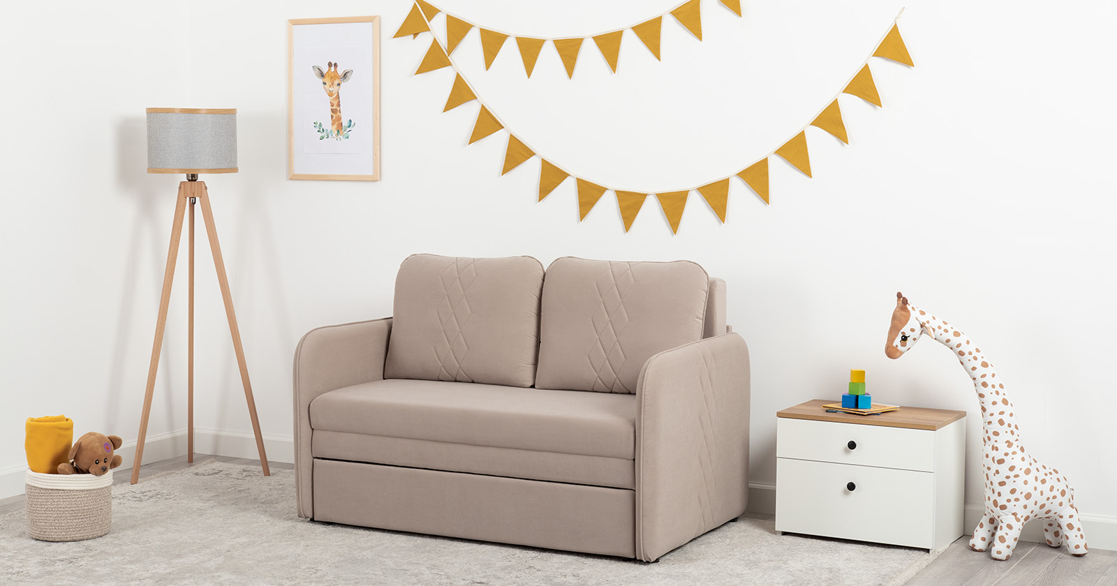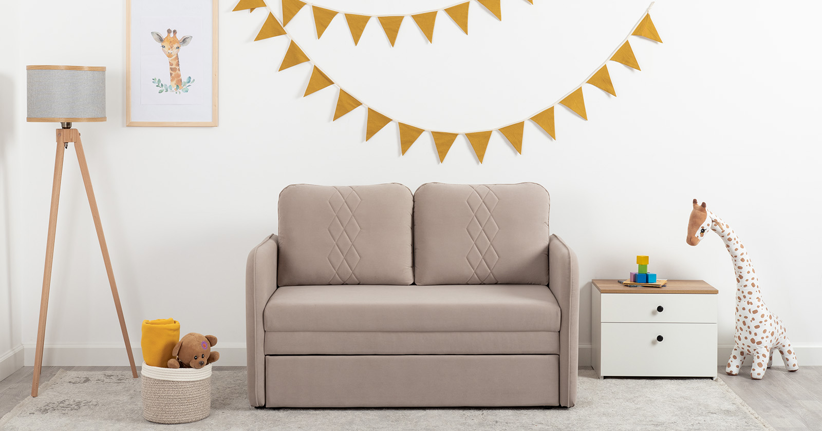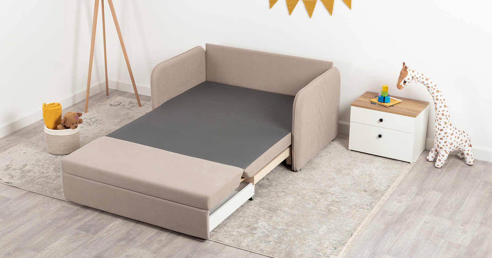 Стильный компактный диван для детской и гостиной. При своих скромных размерах он трансформируется в полноценное спальное место для детей и подростков. Лаконичный дизайн в виде декоративной стежки подчеркивает фактуру велюра, а небольшие размеры позволят разместить его в любом пространстве.