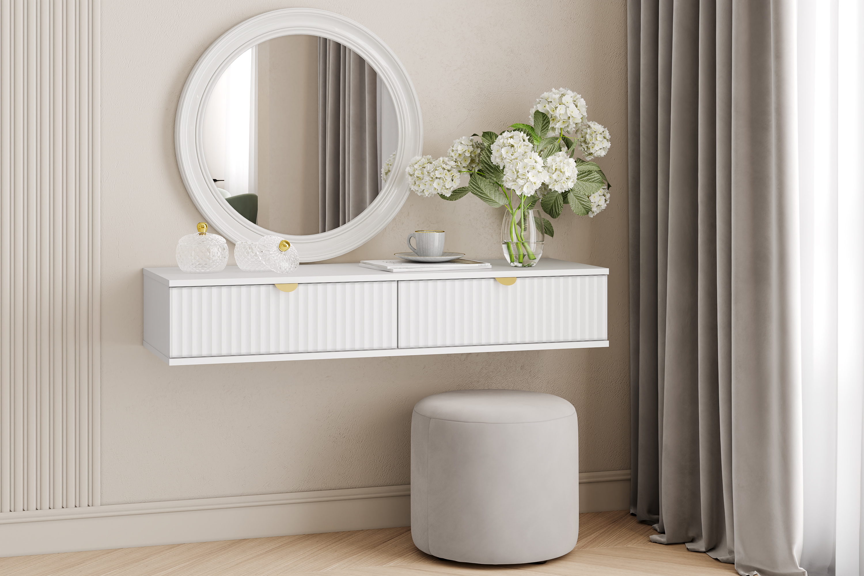 Модульная композиция включает тумбу и комод, оснащенные выдвижными ящиками, которые открываются плавно и бесшумно благодаря шариковым направляющим, при этом высокие опоры облегчают процесс уборки.