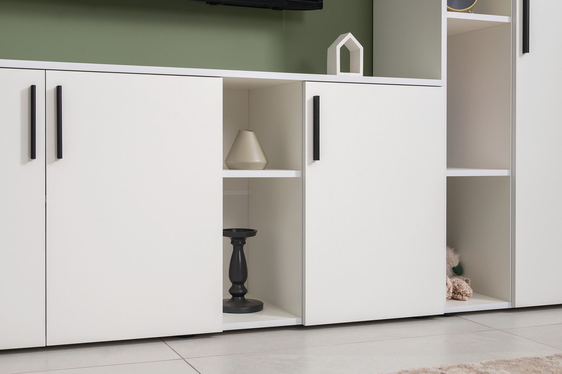 Модули универсальны и сочетаются между собой. Открытые и закрытые ниши для хранения, защитные пластиковые демпферы, съемные полки, направляющие полного выдвижения в ящиках – комфорт продуман до мелочей.