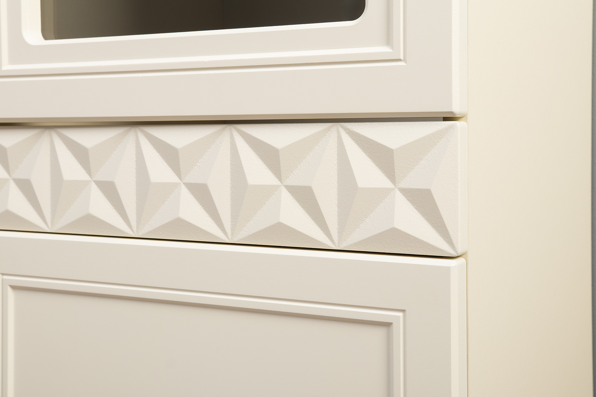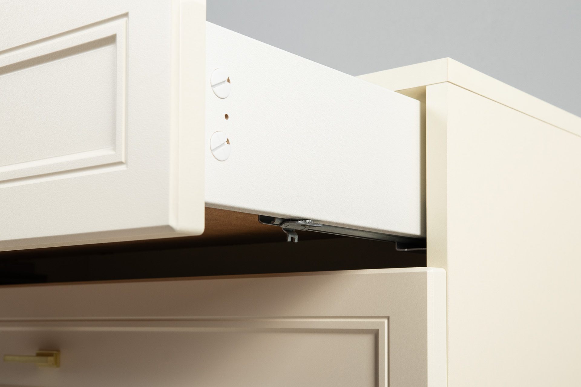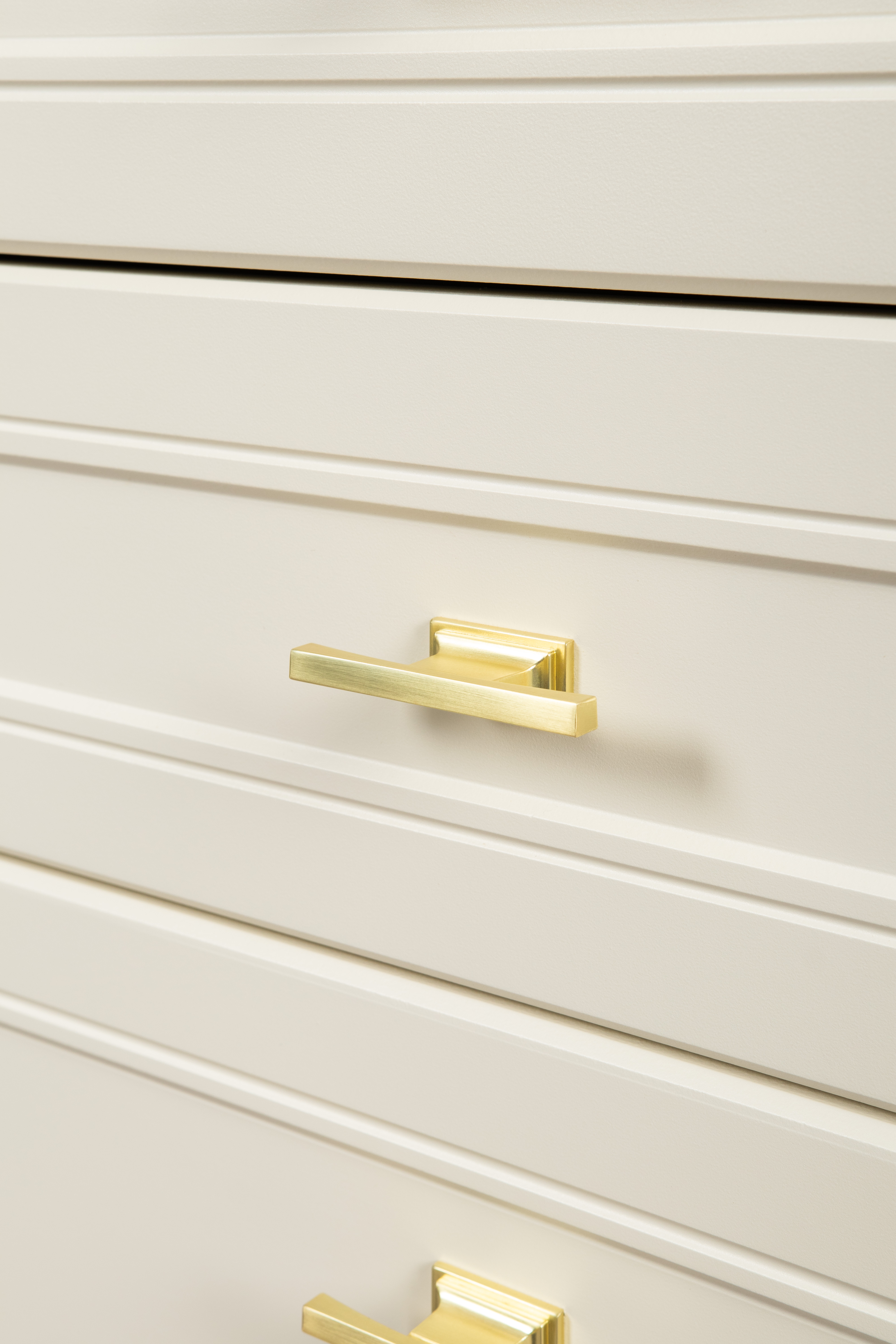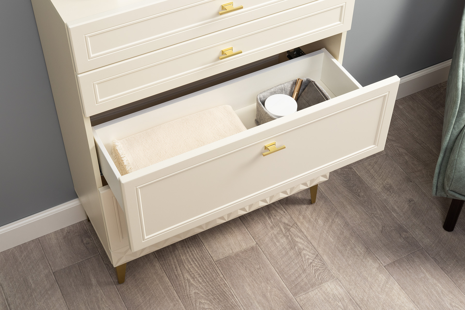 Изящные линии, глубокая фрезеровка фасадов из МДФ и благородные оттенки. Утончённая «Слоновая кость» и изысканная «Олива Шагрень» с глубоким зелёным тоном — создают атмосферу уюта, тепла и благородства. Металлические ручки и опоры золотого цвета придают мебели утончённый блеск, а петли и направляющие с доводчиками обеспечивают плавное и бесшумное закрытие фасадов.