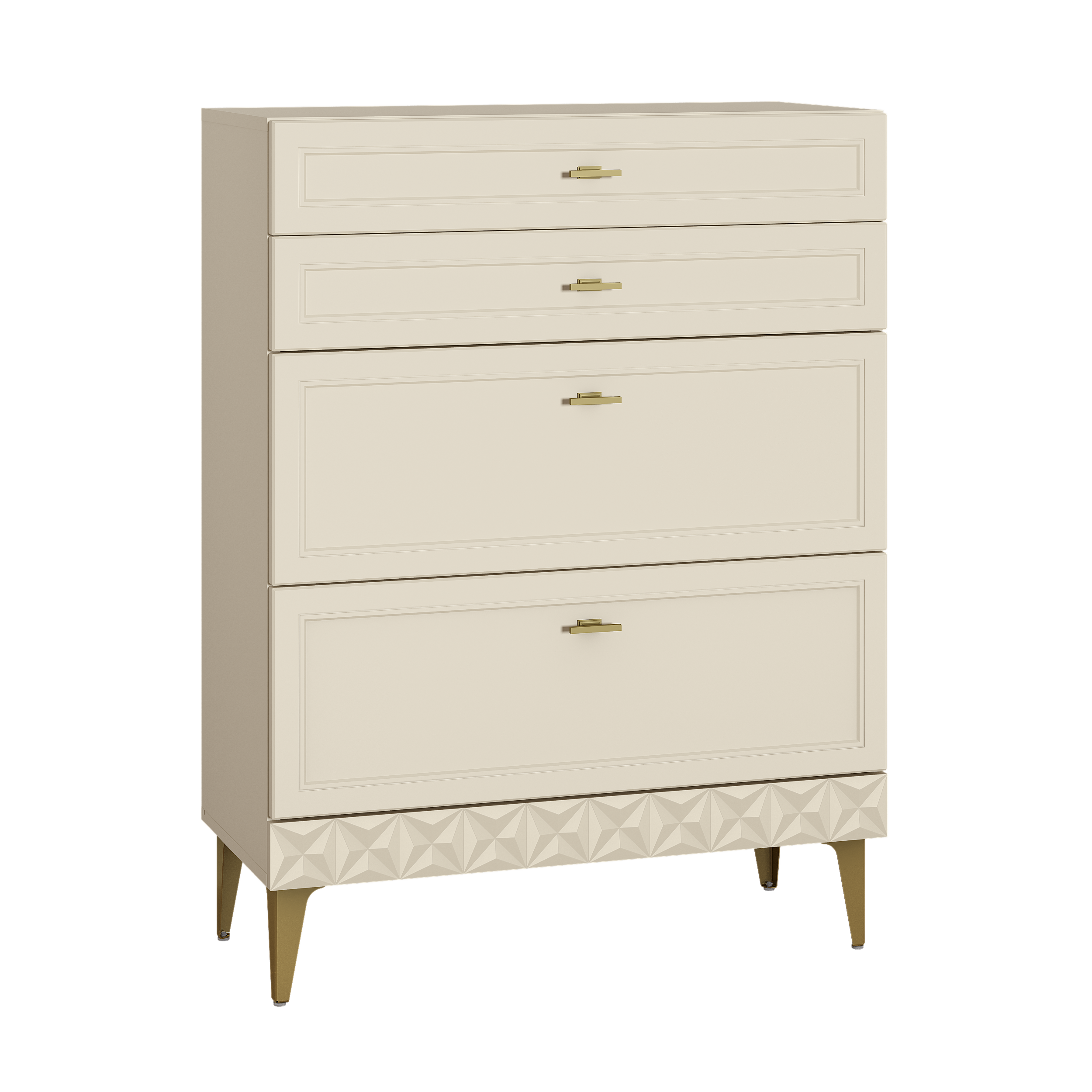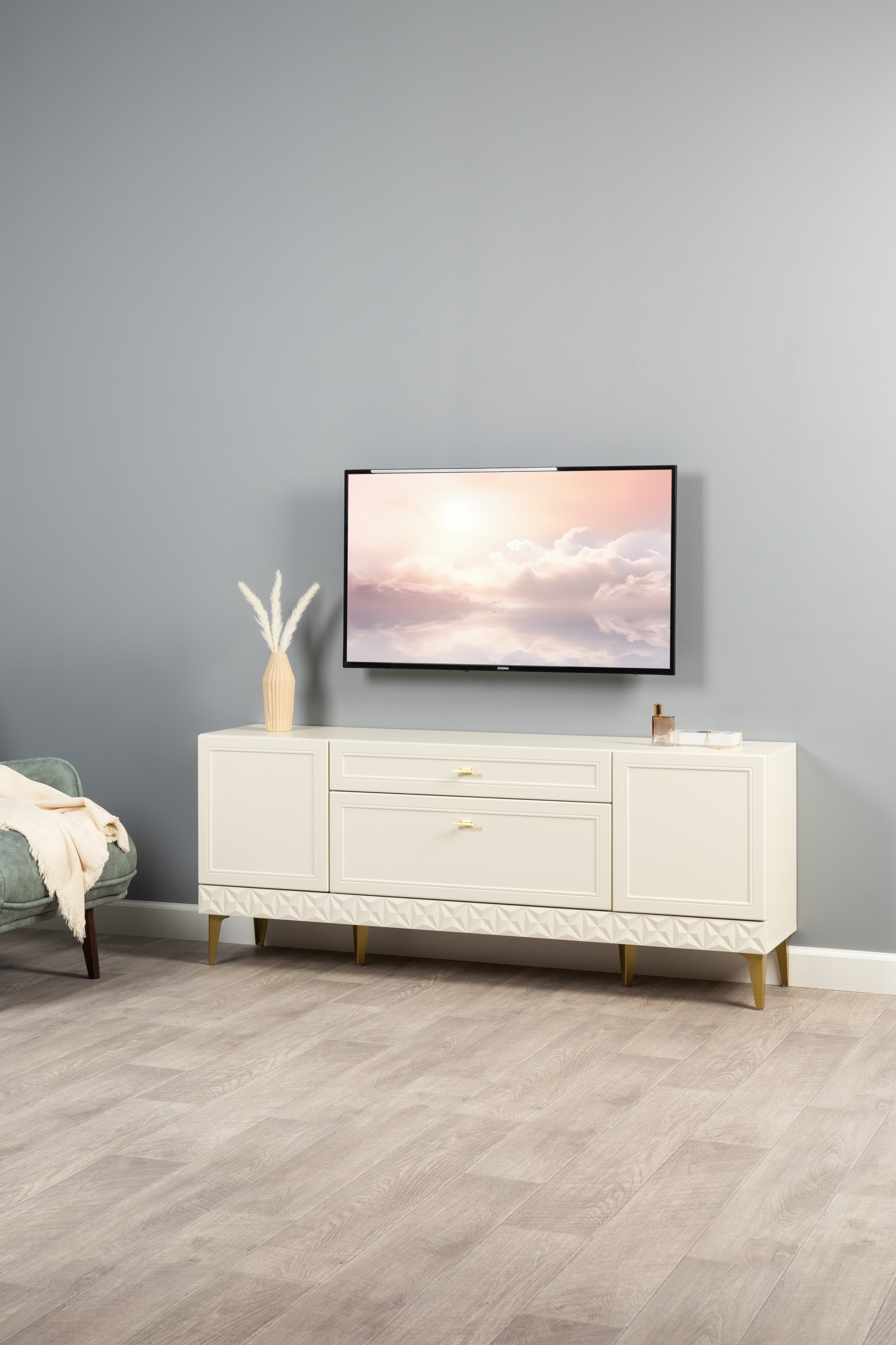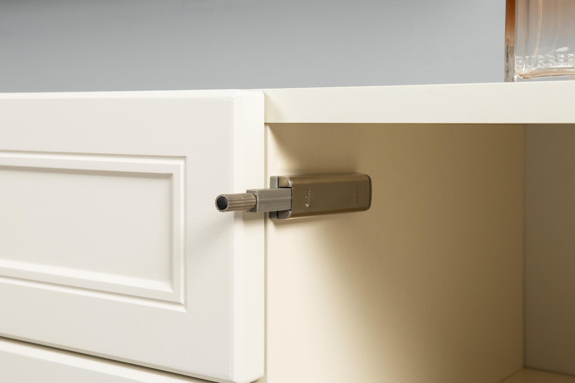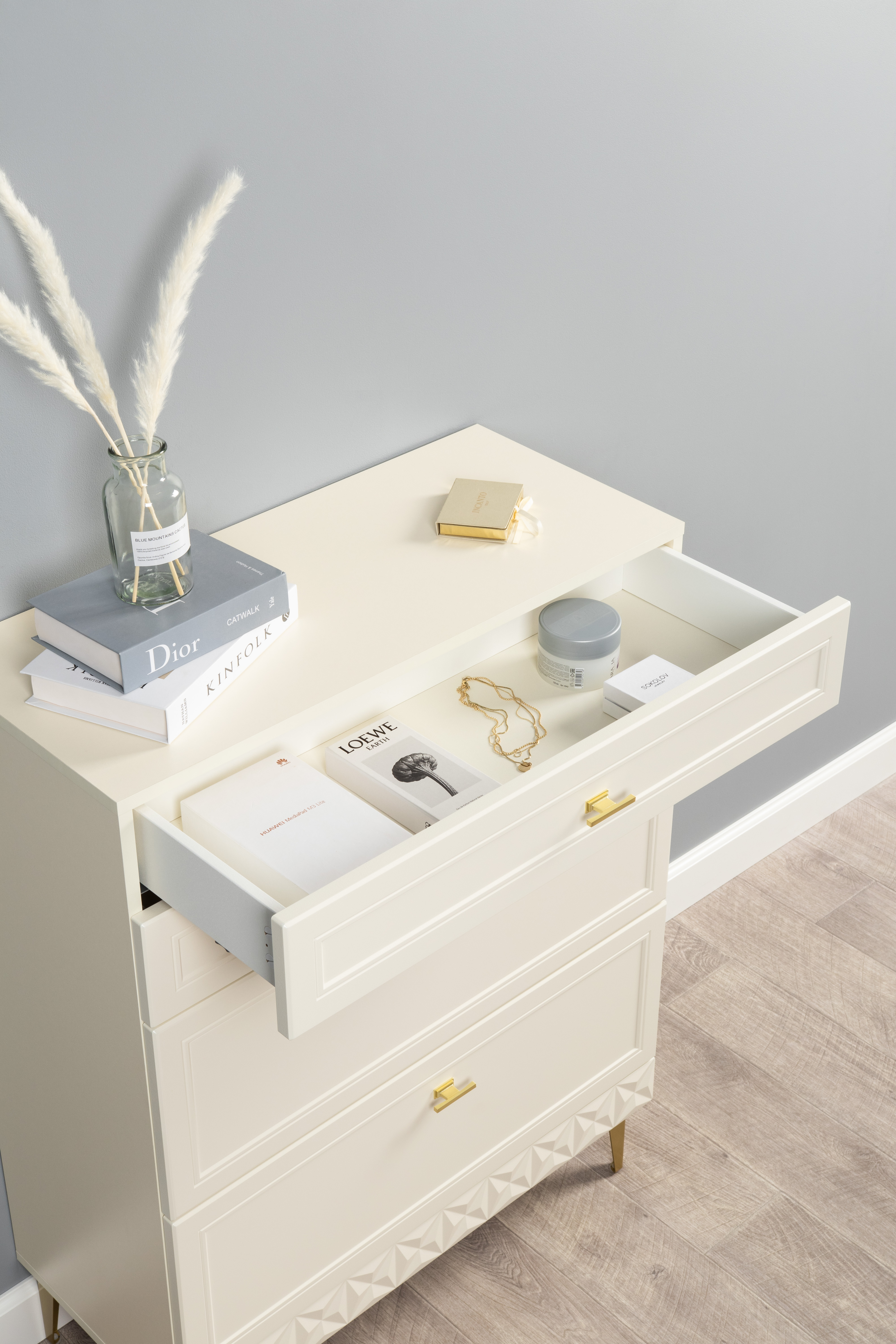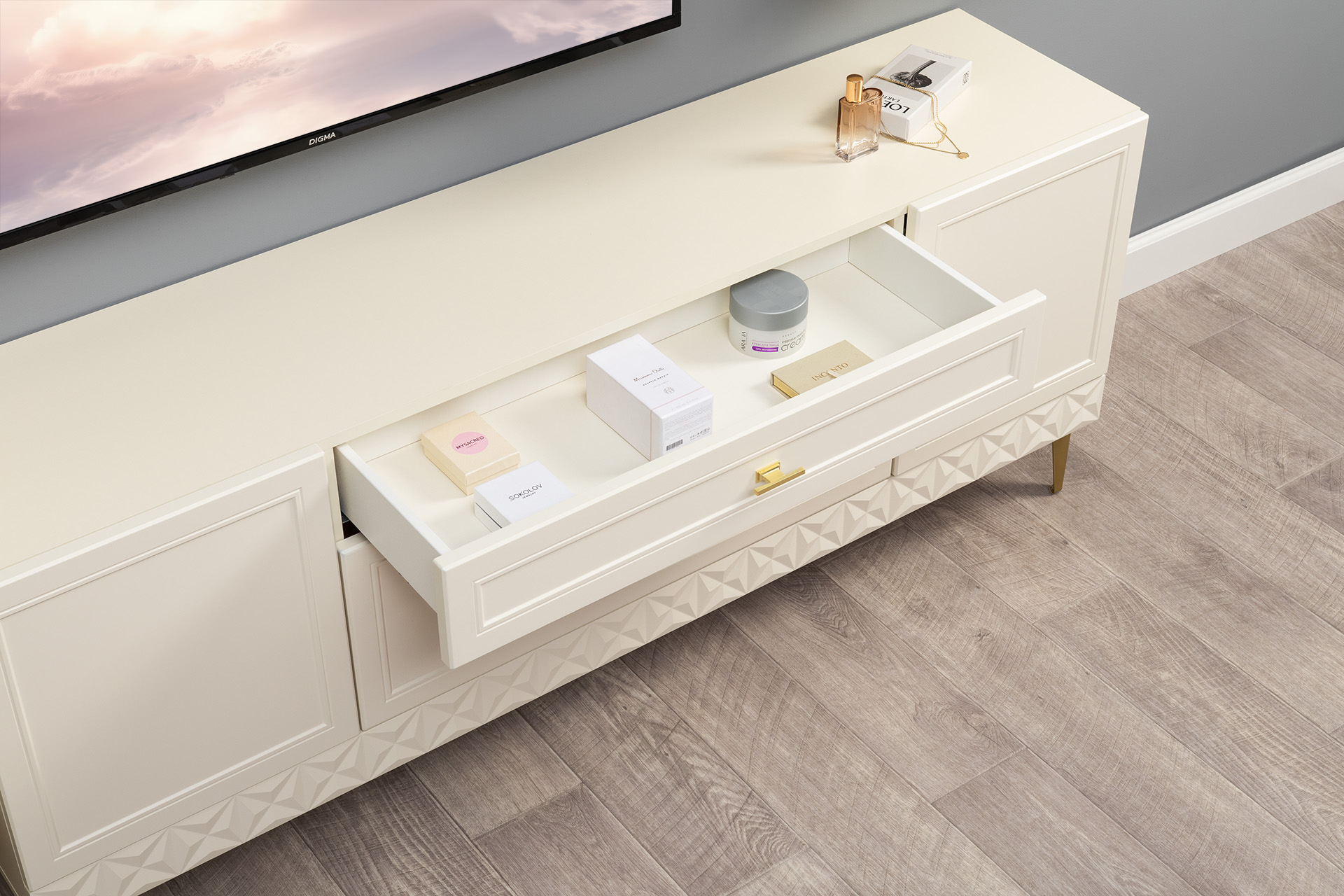 Изящные линии, глубокая фрезеровка фасадов из МДФ и благородные оттенки. Утончённая «Слоновая кость» и изысканная «Олива Шагрень» с глубоким зелёным тоном — создают атмосферу уюта, тепла и благородства. Металлические ручки и опоры золотого цвета придают мебели утончённый блеск, а петли и направляющие с доводчиками обеспечивают плавное и бесшумное закрытие фасадов.