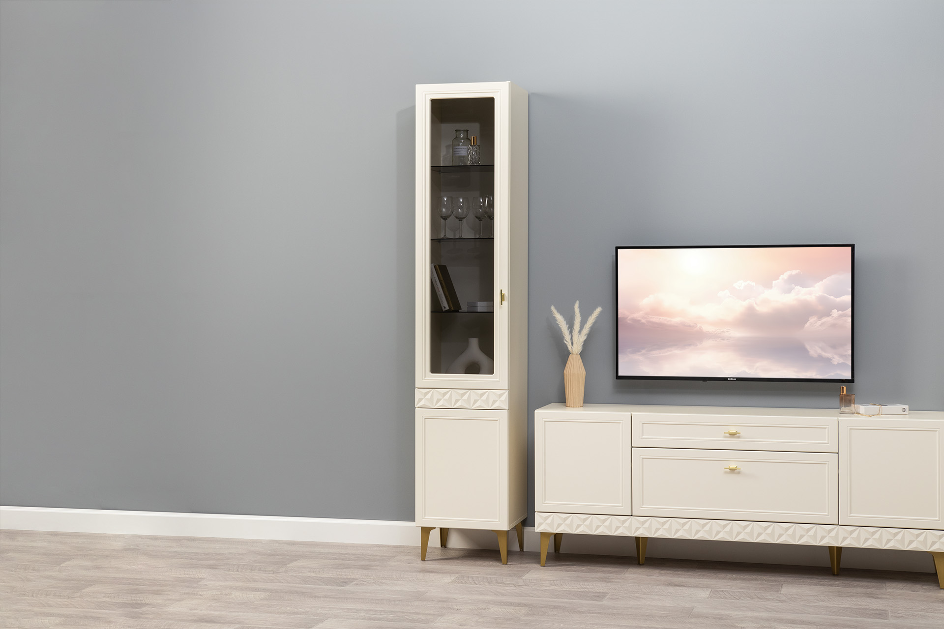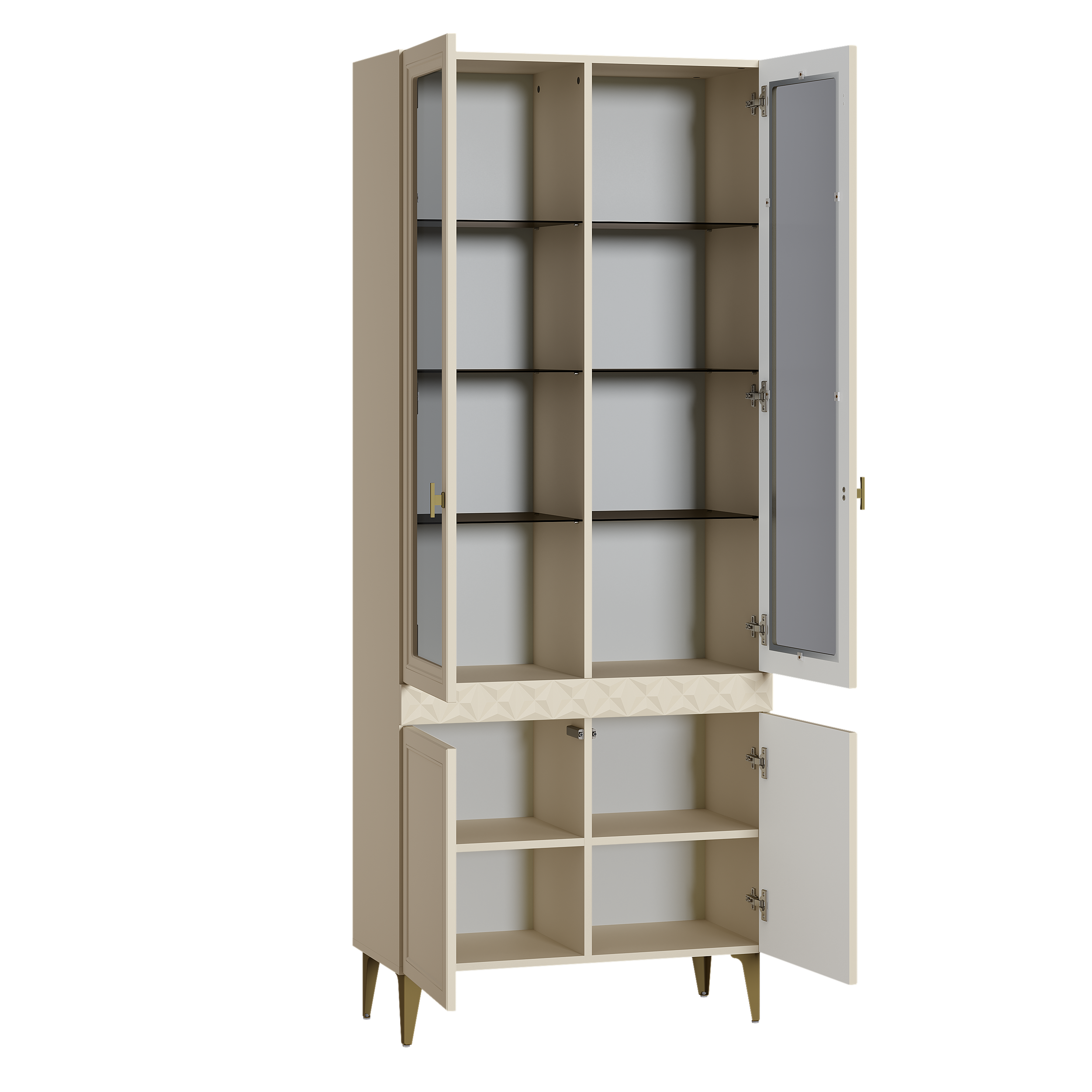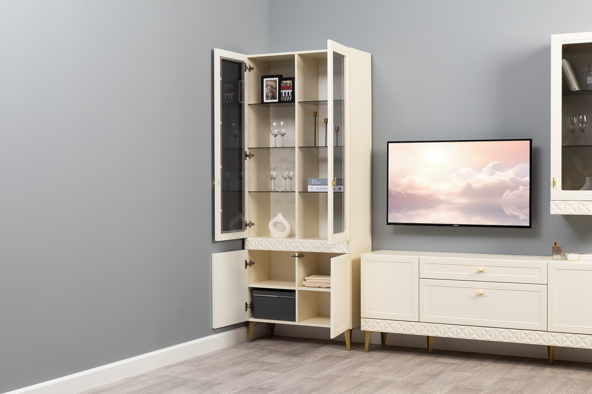В коллекции представлены три типа витрин с тонированным закалённым стеклом, которые придают пространству лёгкость и свет. «Марион» — идеальное сочетание традиций и актуального дизайна в каждой детали.
