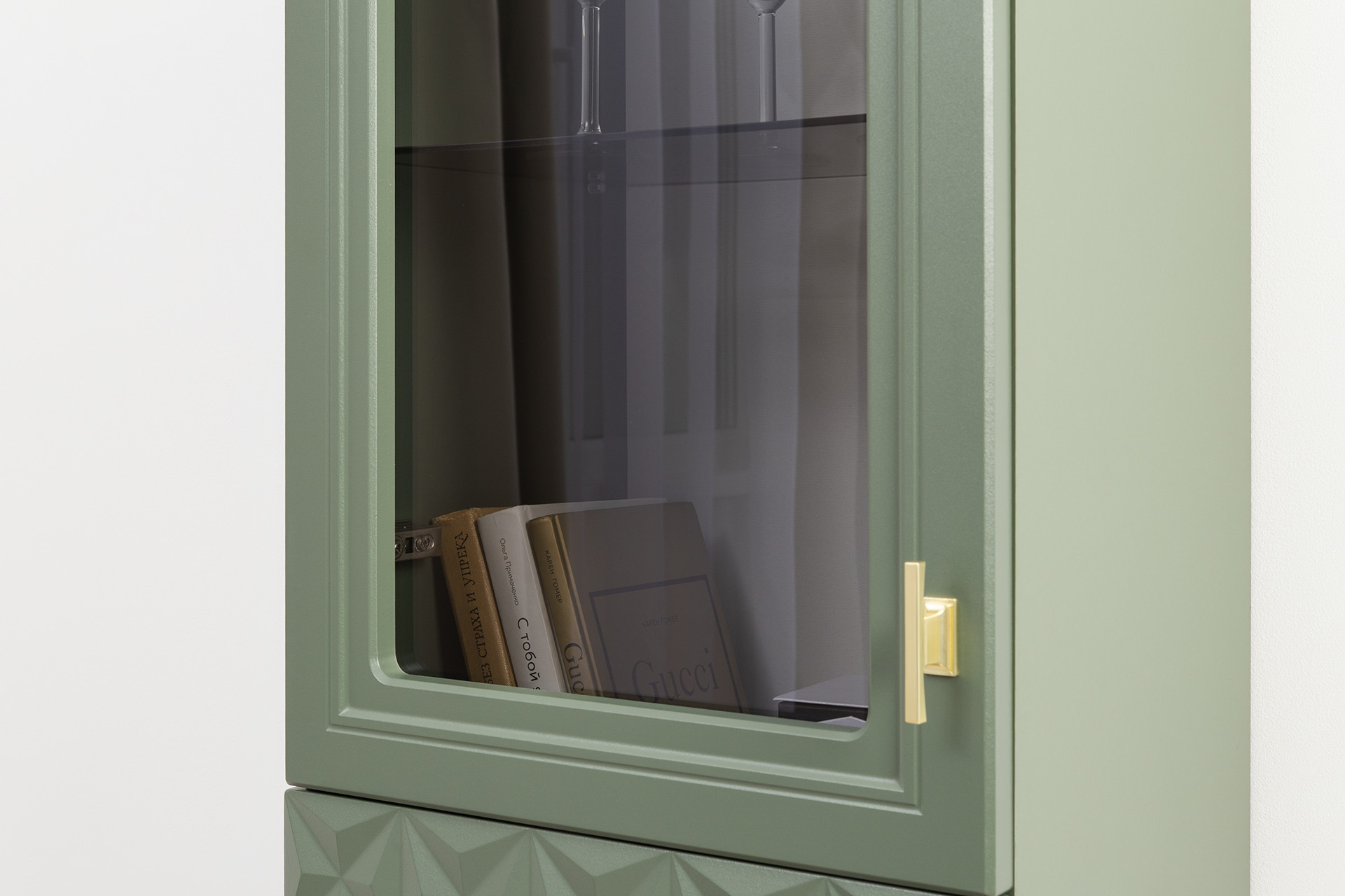 Изящные линии, глубокая фрезеровка фасадов из МДФ и благородные оттенки. Утончённая «Слоновая кость» и изысканная «Олива Шагрень» с глубоким зелёным тоном — создают атмосферу уюта, тепла и благородства. Металлические ручки и опоры золотого цвета придают мебели утончённый блеск, а петли и направляющие с доводчиками обеспечивают плавное и бесшумное закрытие фасадов.