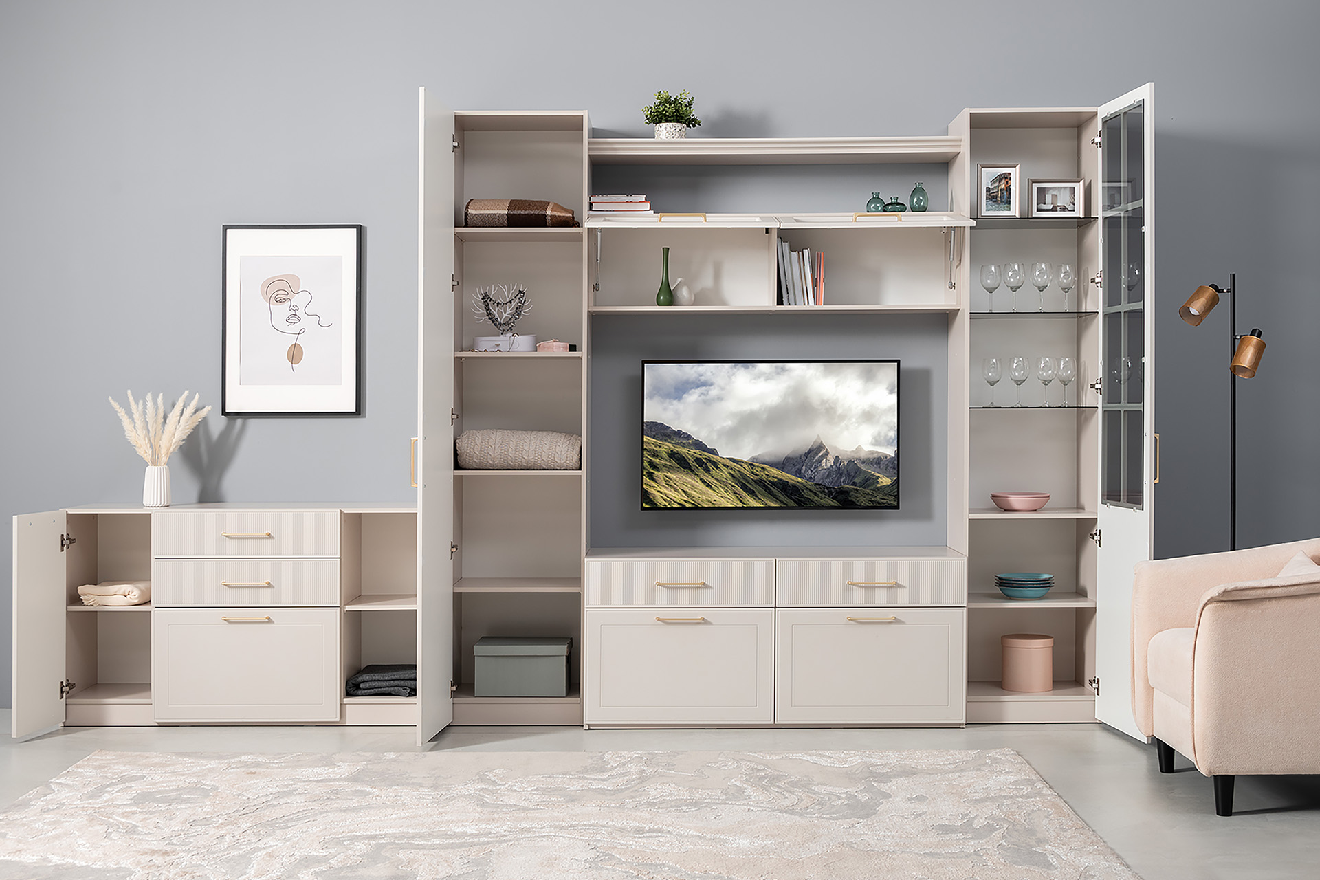 Гостиная Ричфорд композиция 2 без карнизов, кашемир 5981 BS, моно керамика D166-2 ПВХ, белый PE шагрень (собирается на любую сторону)
