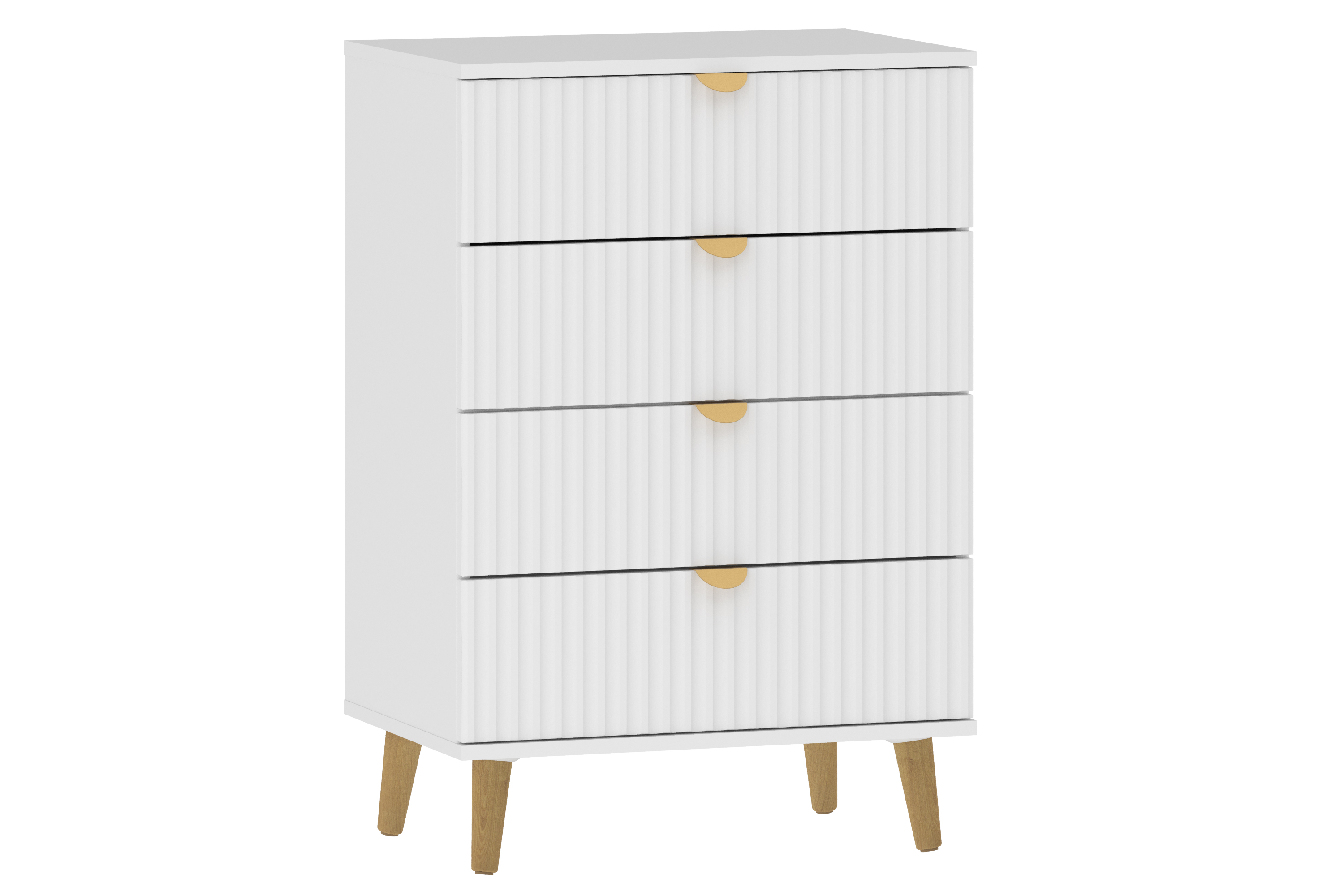 Комод оснащен четырьмя выдвижными ящиками, которые открываются плавно и бесшумно благодаря шариковым направляющим, а высокие опоры облегчают процесс уборки.