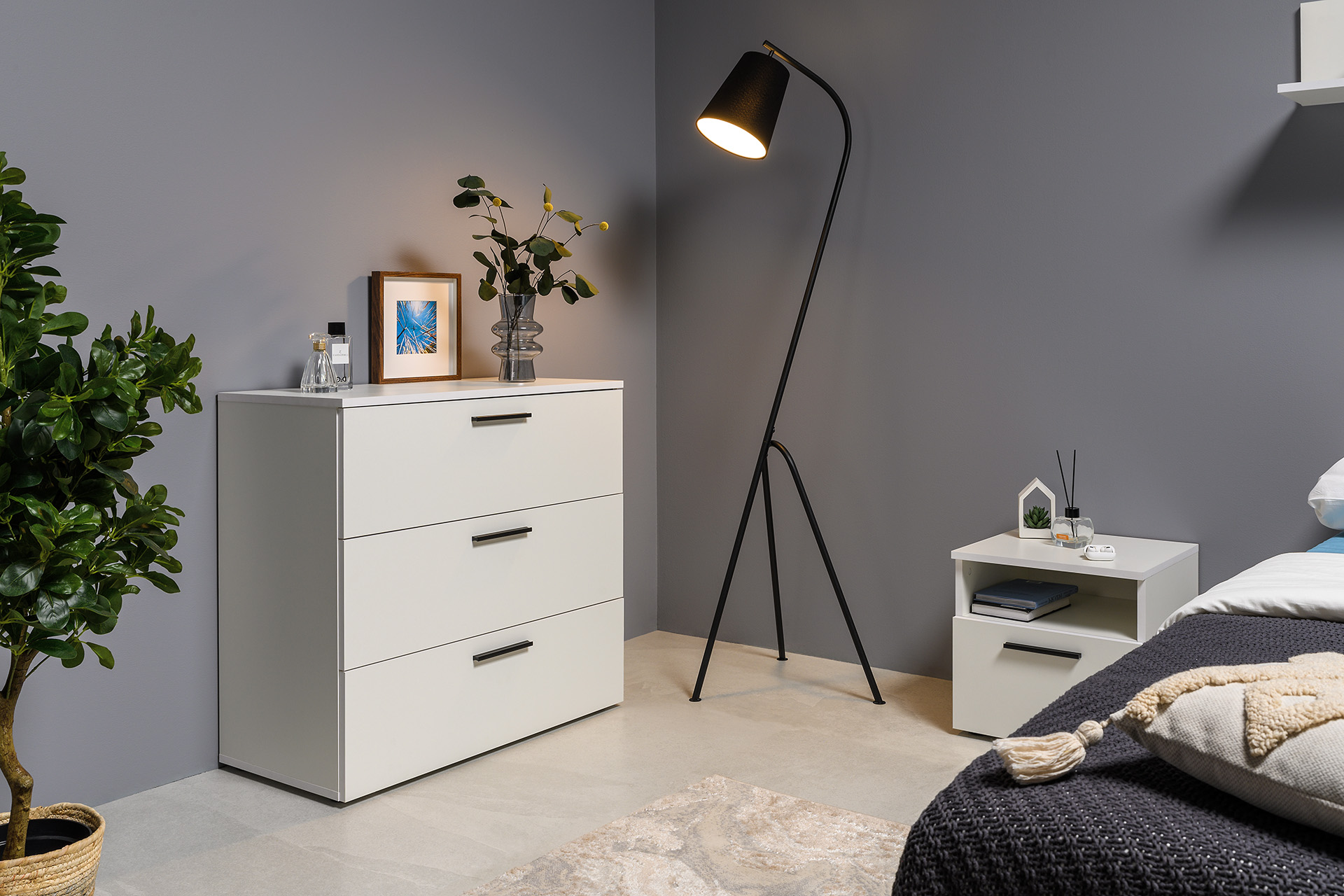 Два варианта кровати: ширина спального места 1200 и 1600 мм. Вместительный трёхстворчатый шкаф полноценной глубины с выдвижными ящиками и съемными полками. Ящики оснащены направляющими полного выдвижения.
