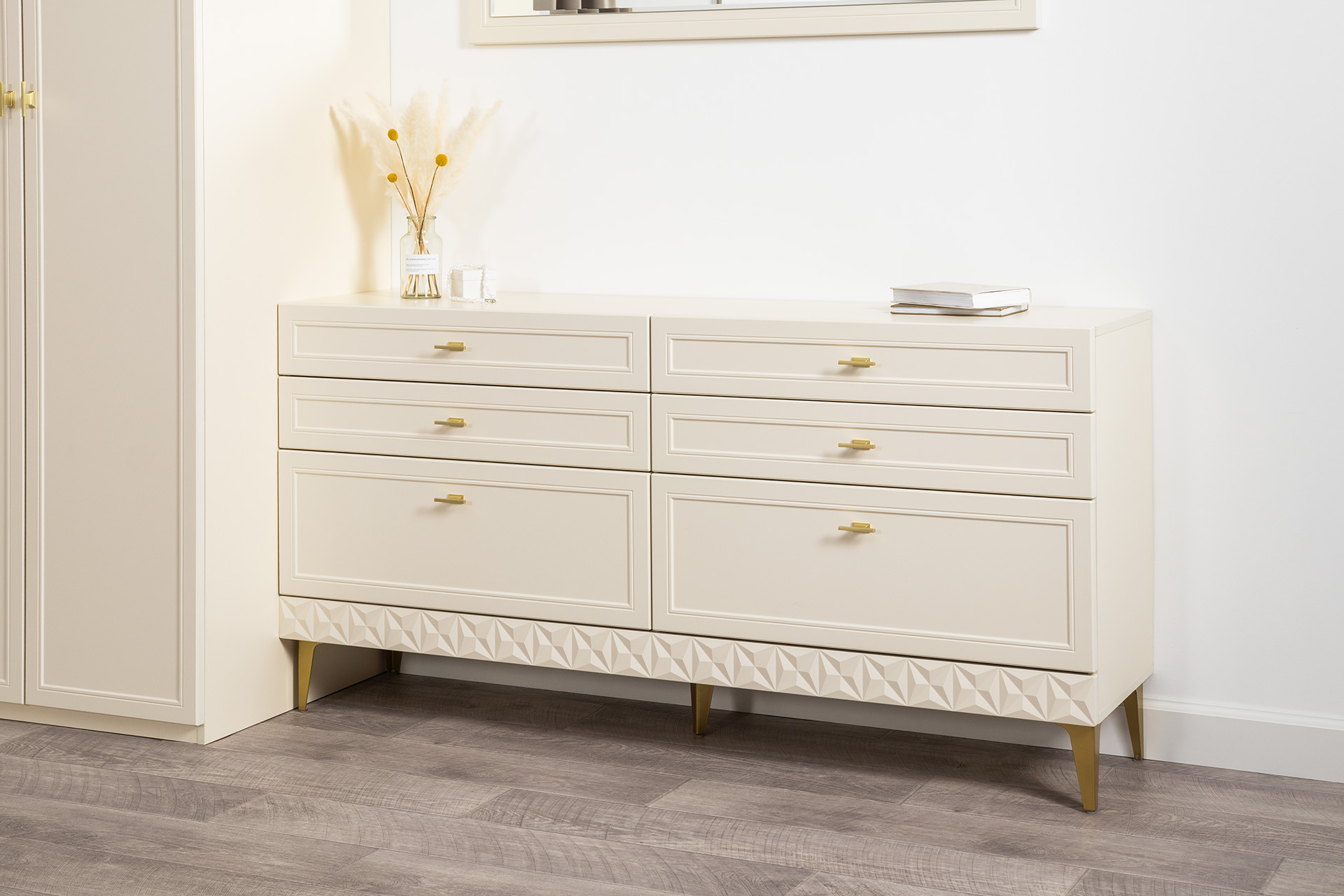 Изящные линии, глубокая фрезеровка фасадов из МДФ и благородные оттенки. Утончённая «Слоновая кость» и изысканная «Олива Шагрень» с глубоким зелёным тоном — создают атмосферу уюта, тепла и благородства. Металлические ручки и опоры золотого цвета придают мебели утончённый блеск, а петли и направляющие с доводчиками обеспечивают плавное и бесшумное закрытие фасадов.