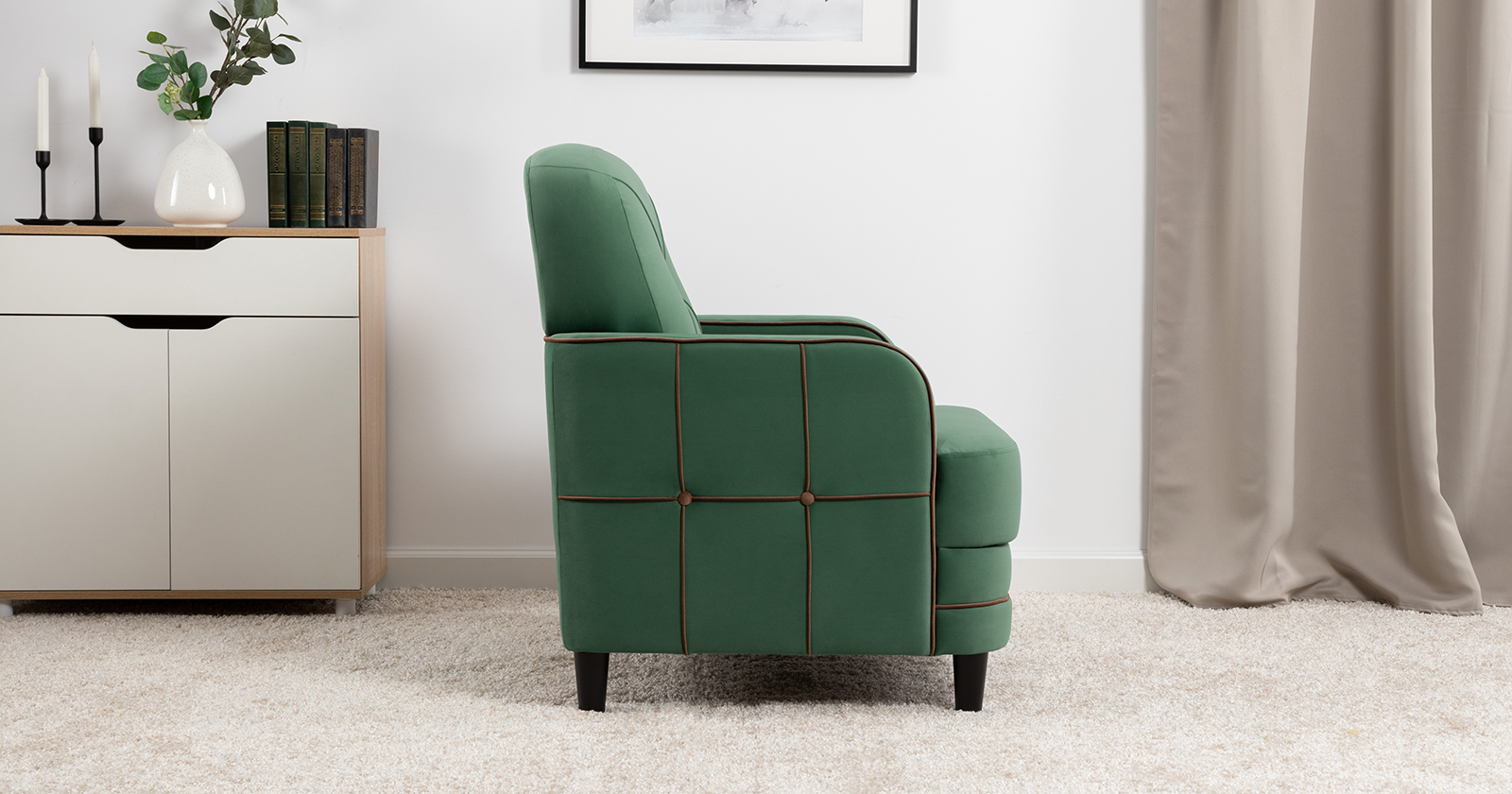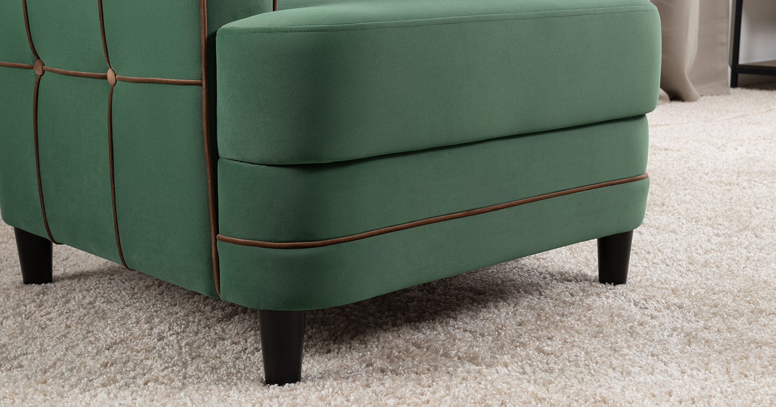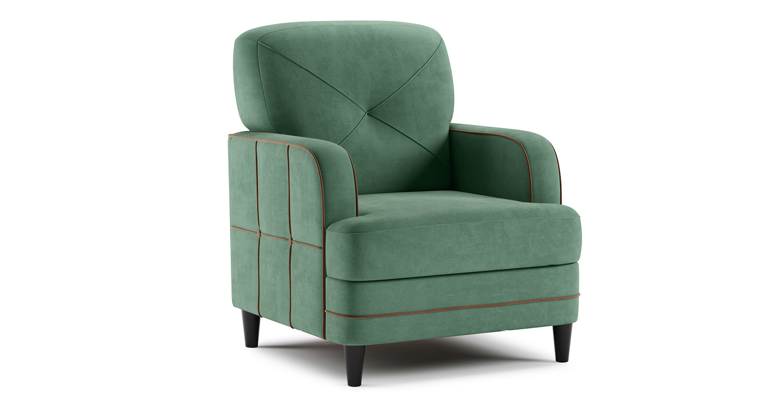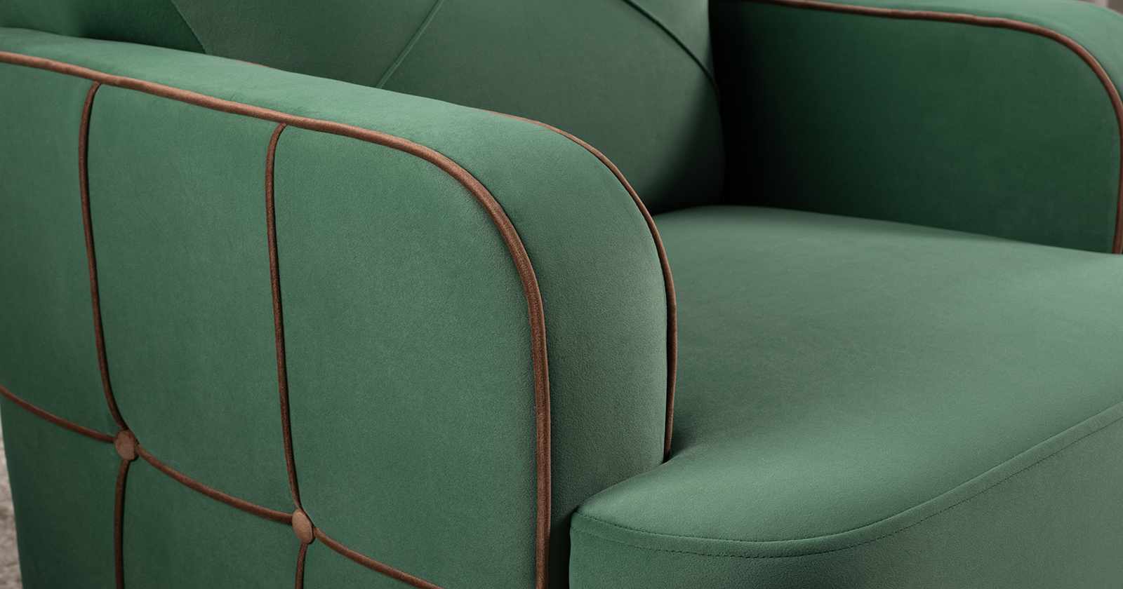 Декоративные канты на вставке подлокотников. Пуговицы в местах пересечения кантов на подушке и вставке подлокотников. По торцам подлокотников и думках контрастный декоративный кант. Защипы на сиденье и подушке.