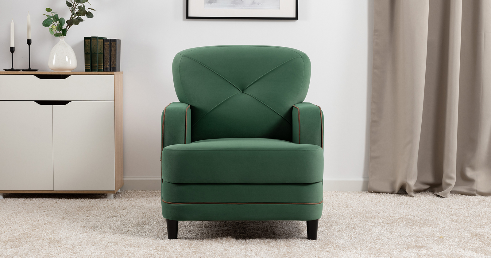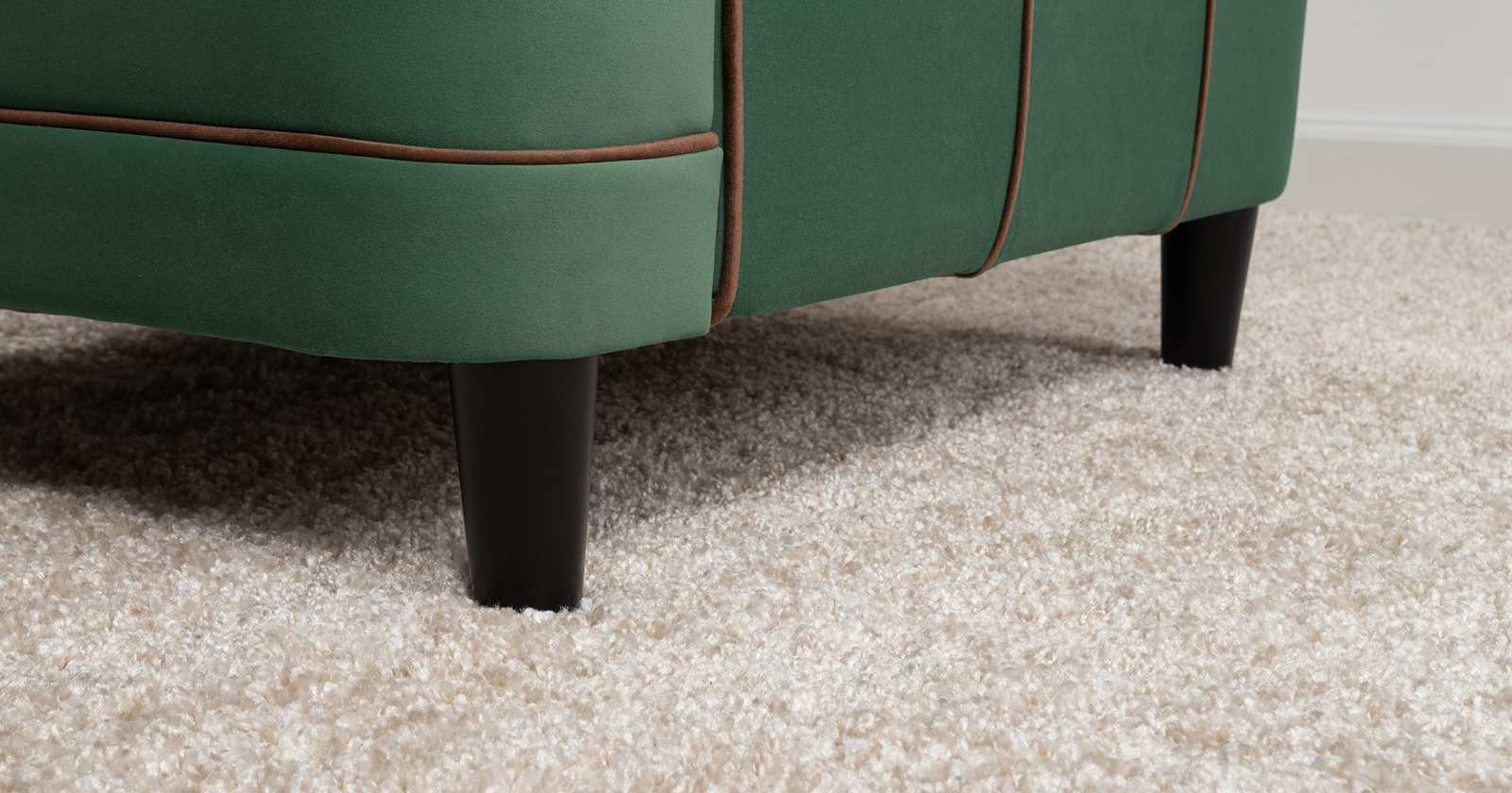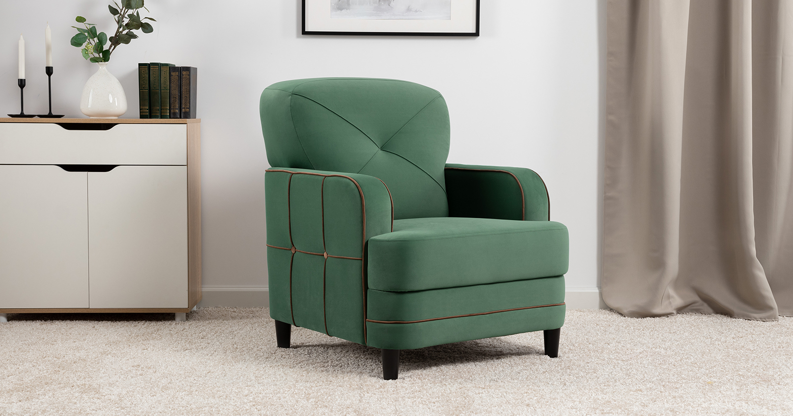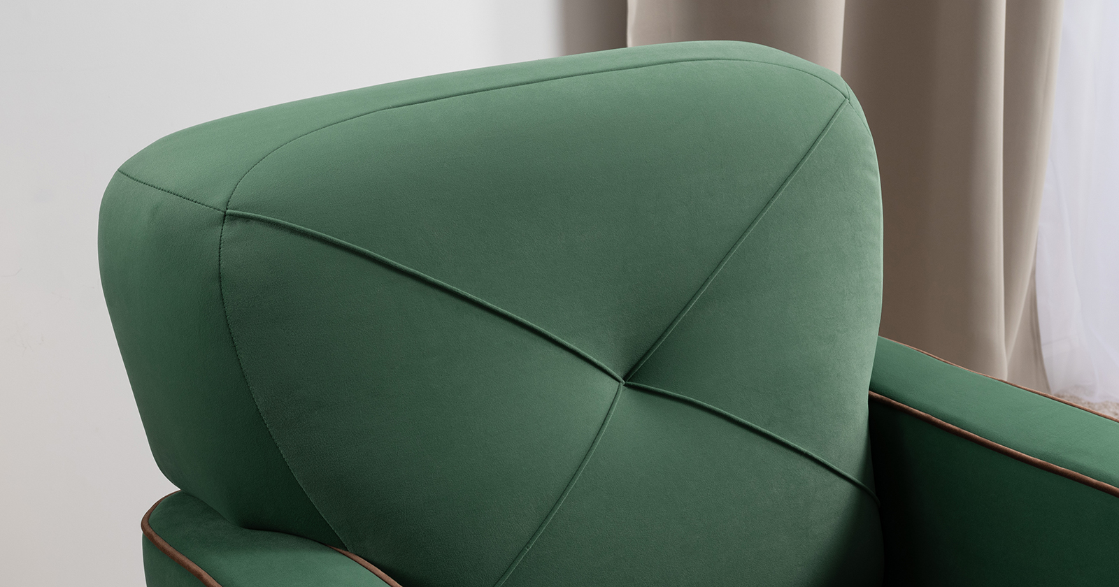 Декоративные канты на вставке подлокотников. Пуговицы в местах пересечения кантов на подушке и вставке подлокотников. По торцам подлокотников и думках контрастный декоративный кант. Защипы на сиденье и подушке.