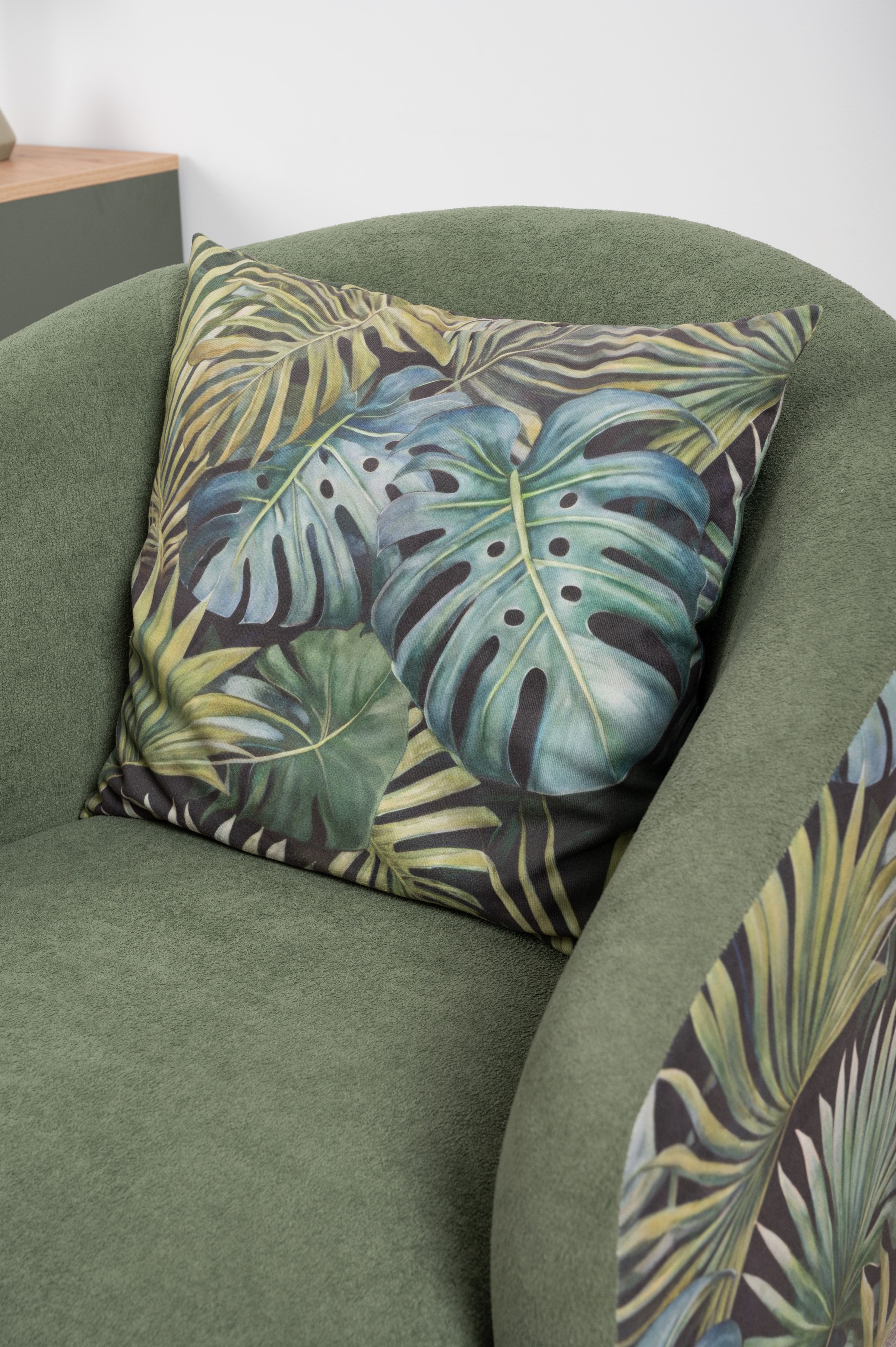Маттиас — оригинальное кресло готовое стать акцентом в интерьере. Яркий тропический принт «монстера» на спинке мгновенно сделает комнату живой и современной.
