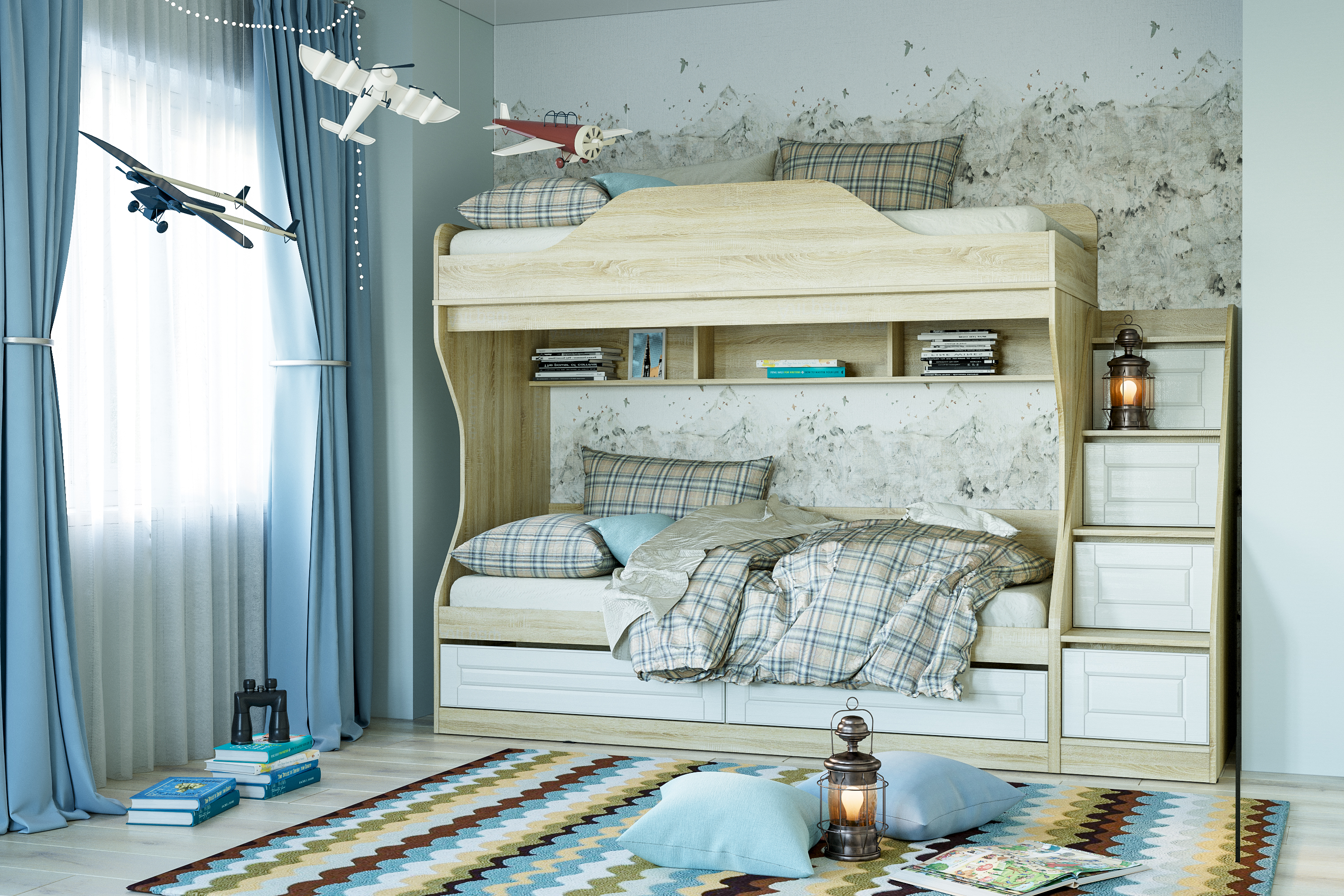 Двухъярусная кровать Оливия сэкономит свободное пространство в комнате, обеспечив спальное место сразу для двоих детей. Модуль оснащен книжной полкой и вместительными бельевыми ящиками, что позволяет использовать их в качестве дополнительного места для хранения вещей. Лестница, которая входит в комплект состоящая их четырех ступеней-ящиков дает дополнительное место для хранения для игрушек и детских вещей. Ограничитель без острых углов на верхнем ярусе, обеспечит ребенку безопасный сон.