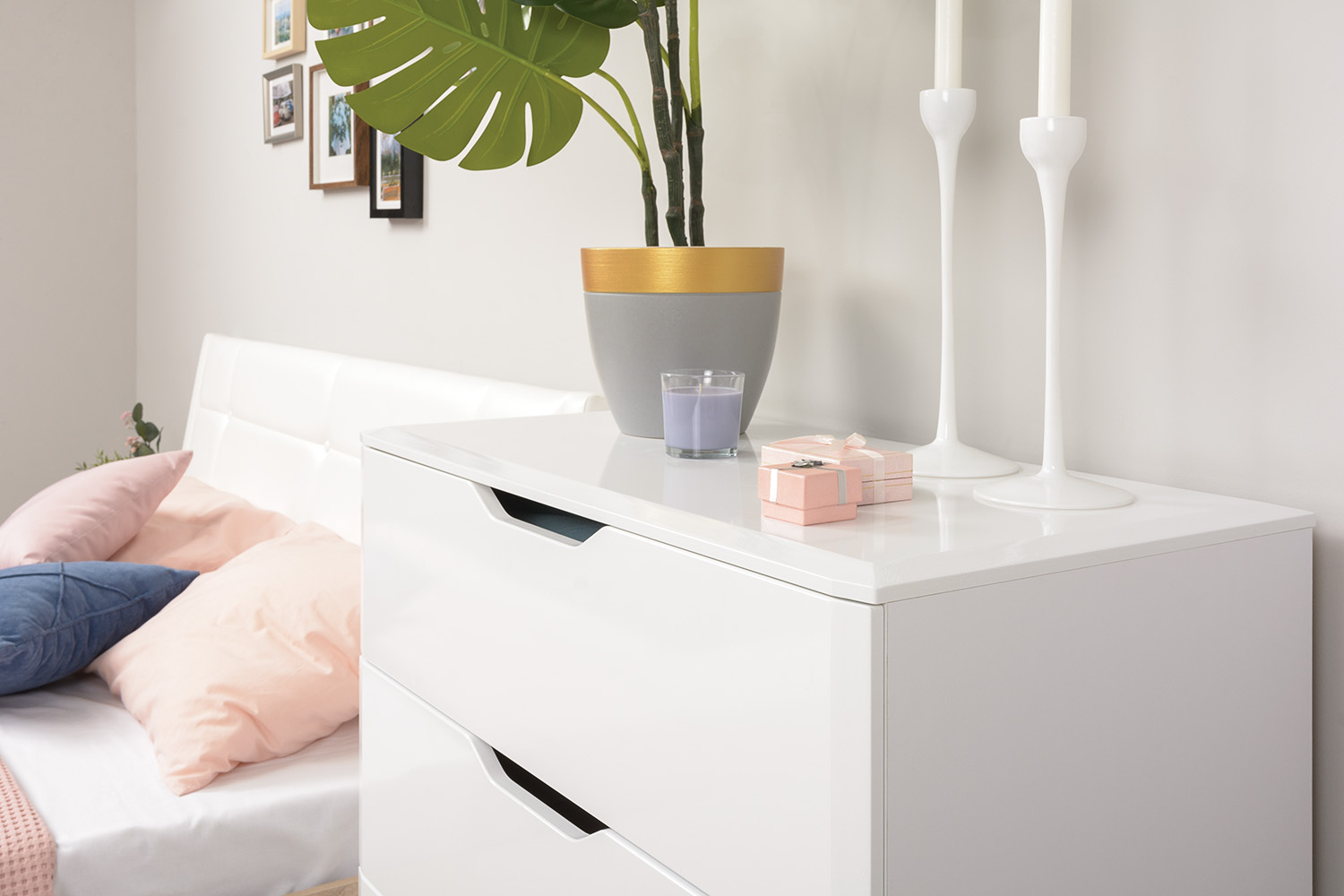 Комод и тумба выполнены в глянцевом белом МДФ с широкой декоративной фаской по граням изделий.