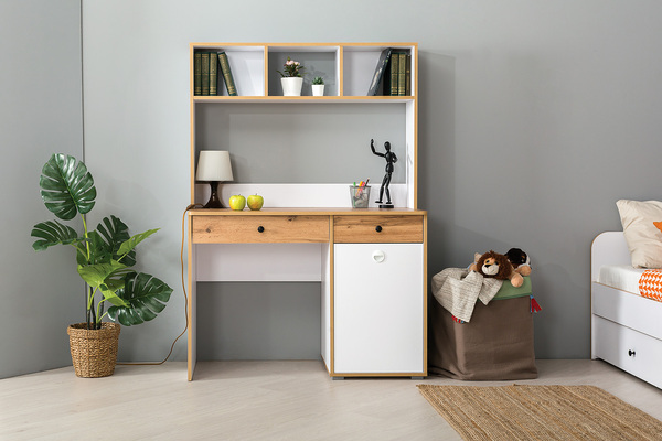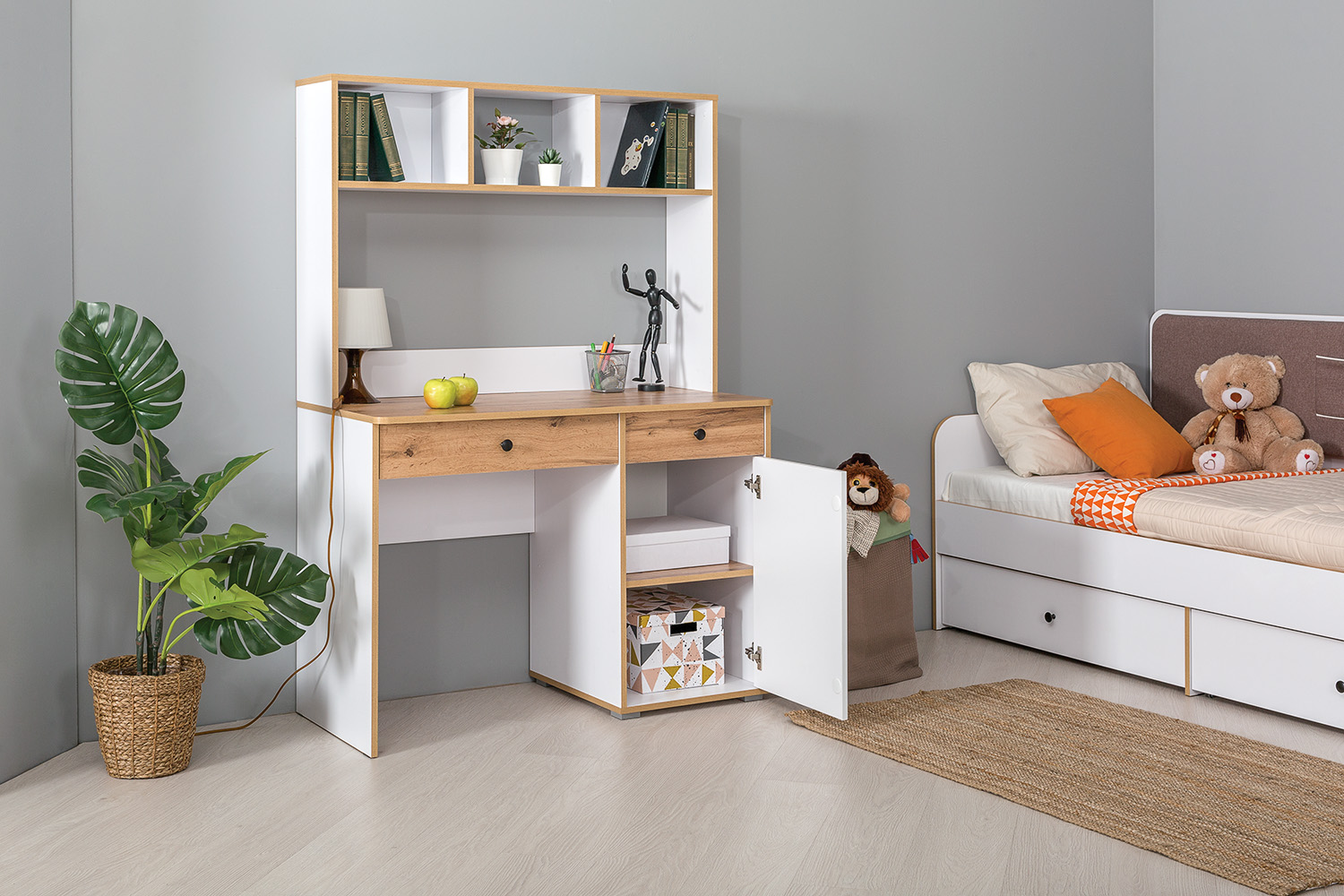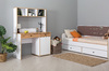 Светлая и аккуратная молодёжная мебель. Основой модульной системы является кровать-трансформер. Её столешница имеет постоянный горизонт, то есть при трансформации не нужно убирать вещи. Система хранения с подъёмными фасадами значительно расширяет функционал.