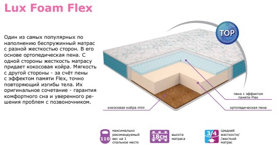 Один из самых популярных по наполнению беспружинный матрас с разной жесткостью сторон. В его основе ортопедическая пена. С одной стороны жесткость матрасу придает кокосовая койра. Мягкость с другой стороны - за счёт пены с эффектом памяти Flex, точно повторяющий изгибы тела. Их оригинальное сочетание - гарантия комфортного сна и уверенного решения проблем с позвоночником.