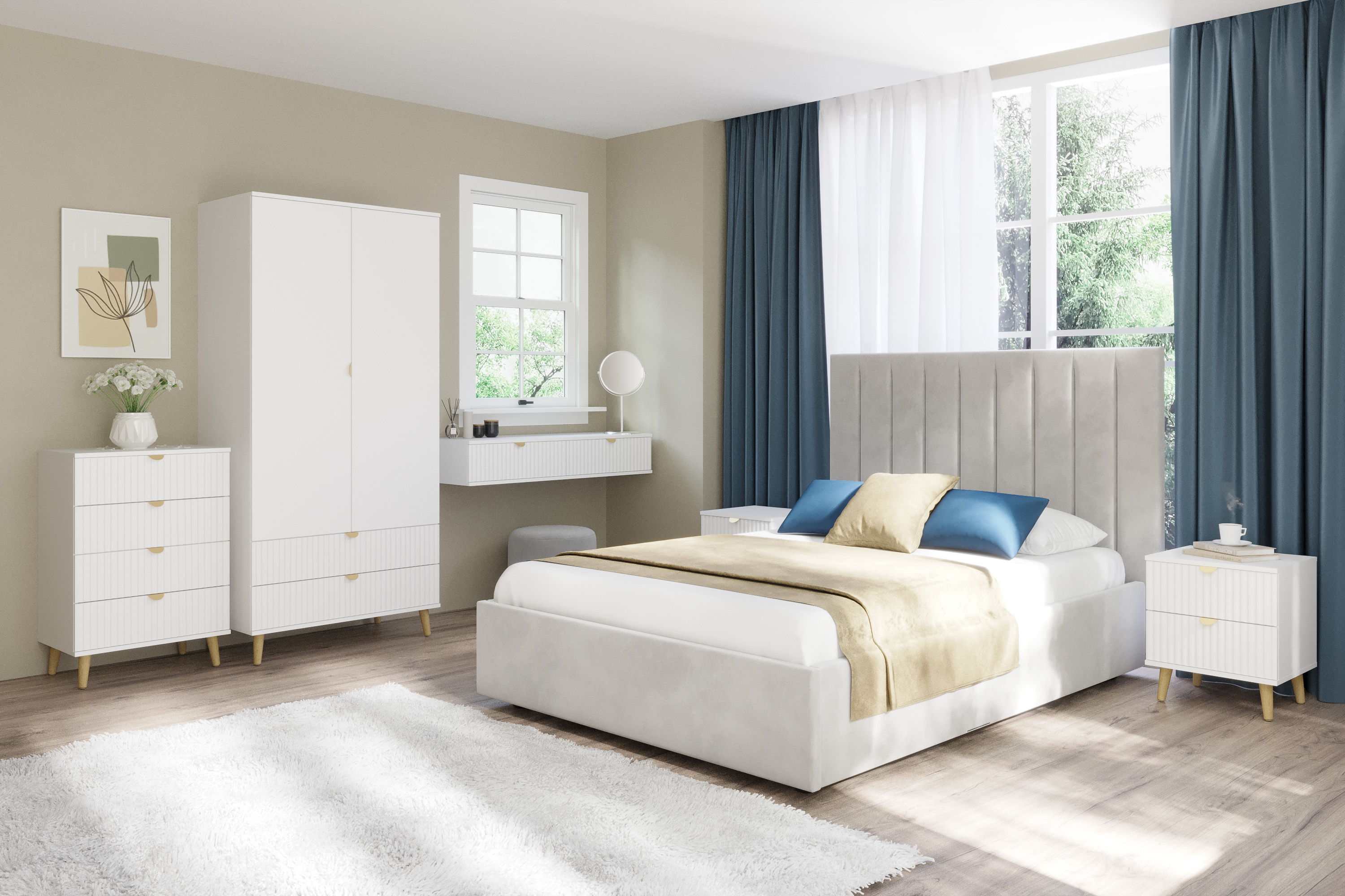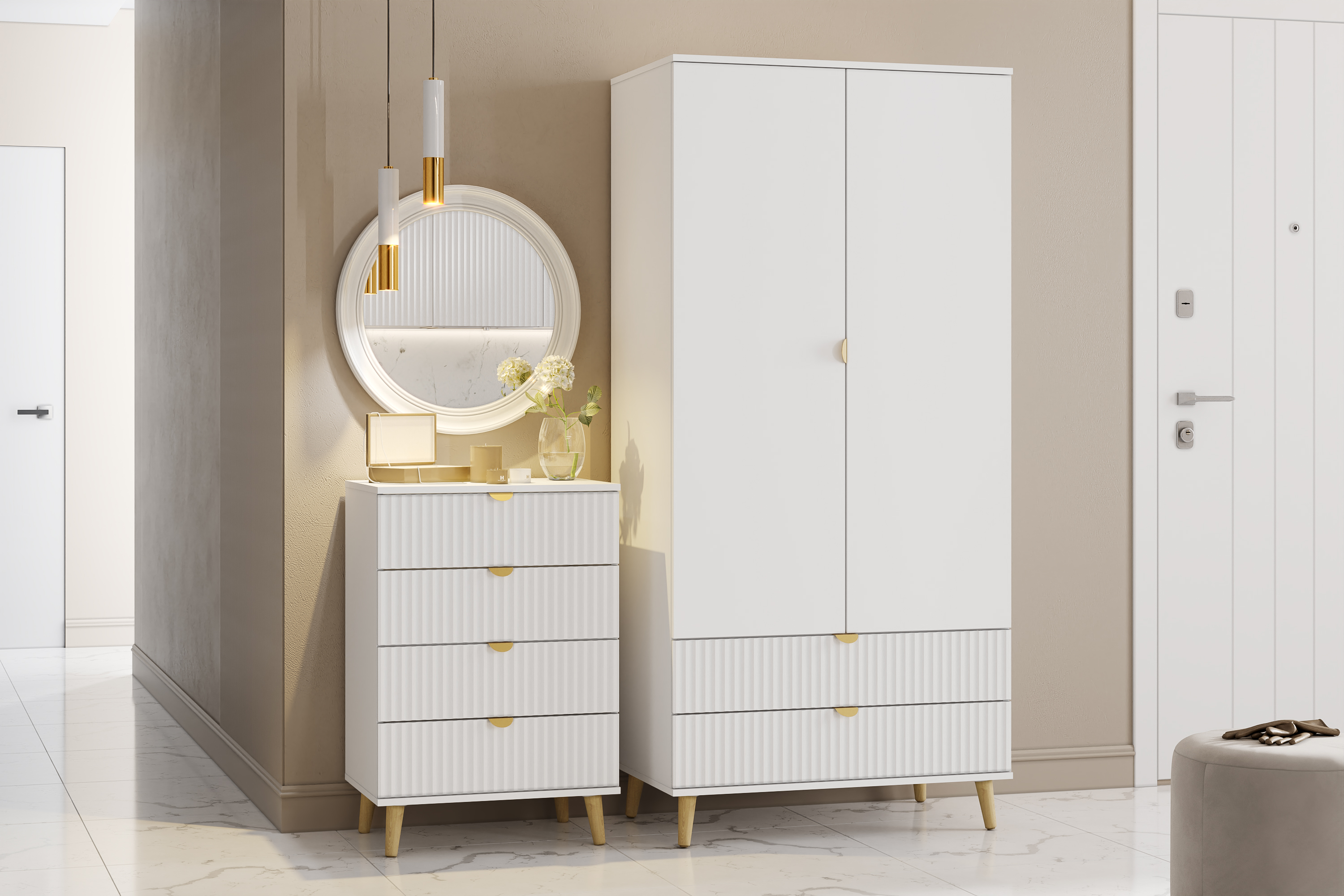 Шкаф оснащен двумя выдвижными ящиками, которые открываются плавно и бесшумно благодаря шариковым направляющим, полками, а также овальной штангой для организации предметов гардероба, а высокие опоры облегчают процесс уборки.