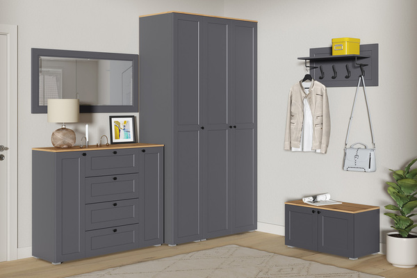 Прихожая доступна в двух цветовых решениях – белый/графит в сочетании с теплым древесным декором.