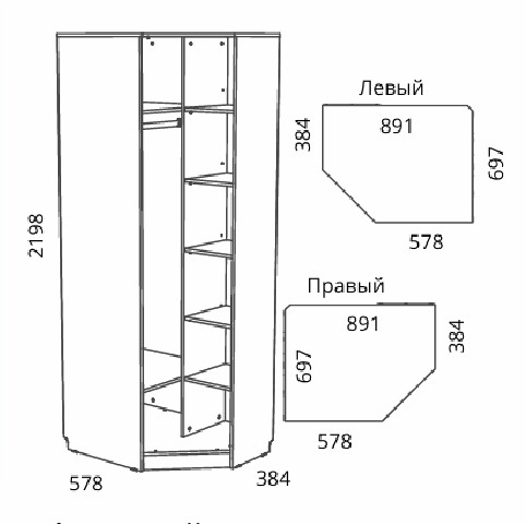 Со шкафом Оливия НМ 014.11 X получится максимально использовать пространство в комнате, задействовав место в углу. Внутри модуль разделен на две функциональные зоны. Секция с пятью полками подходит для хранения одежды в сложенном виде, а на штанге в другой половине шкафа можно разместить одежду на вешалках-плечиках. Две широкие полки, расположенные над и под штангой, удобны для хранения коробок.