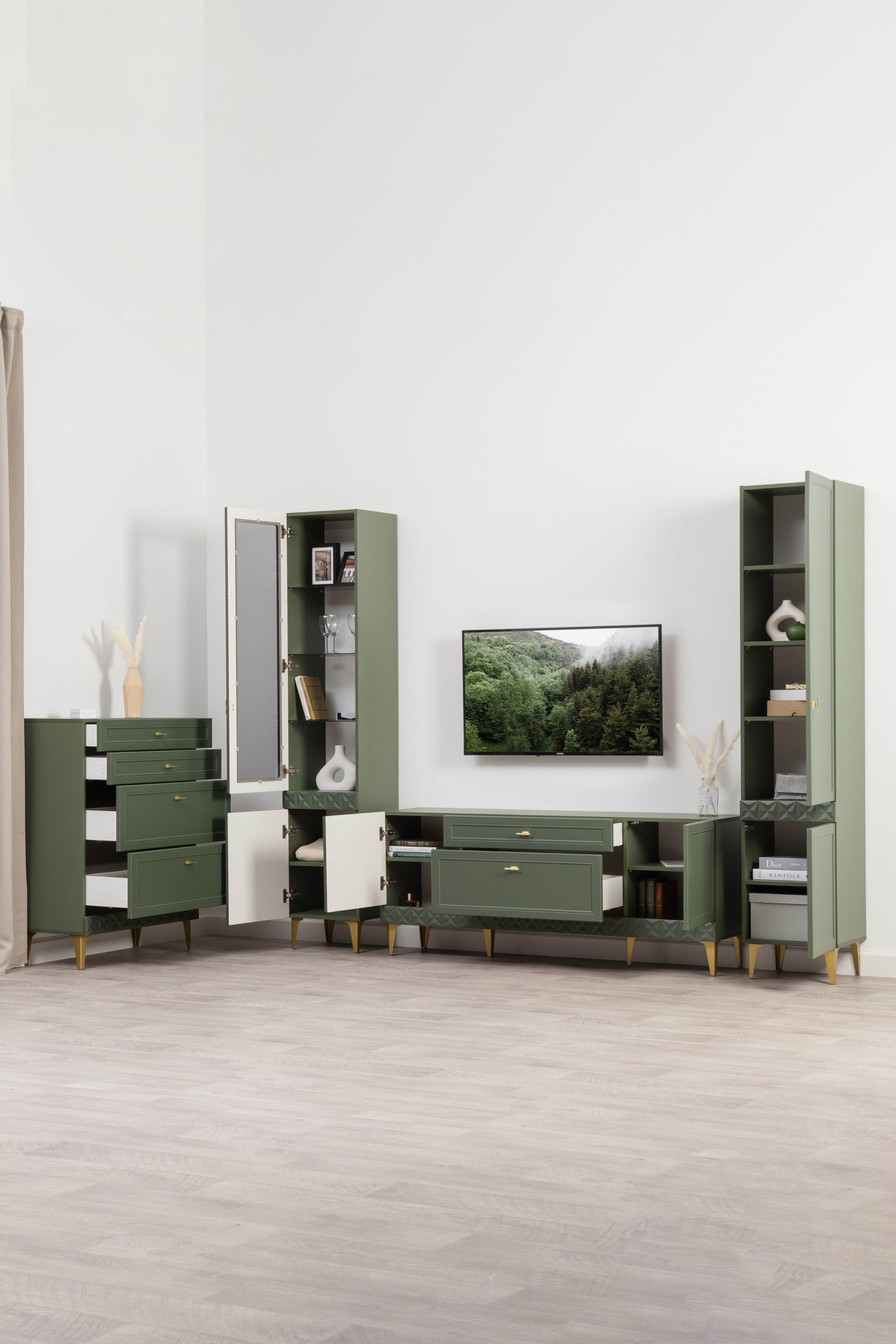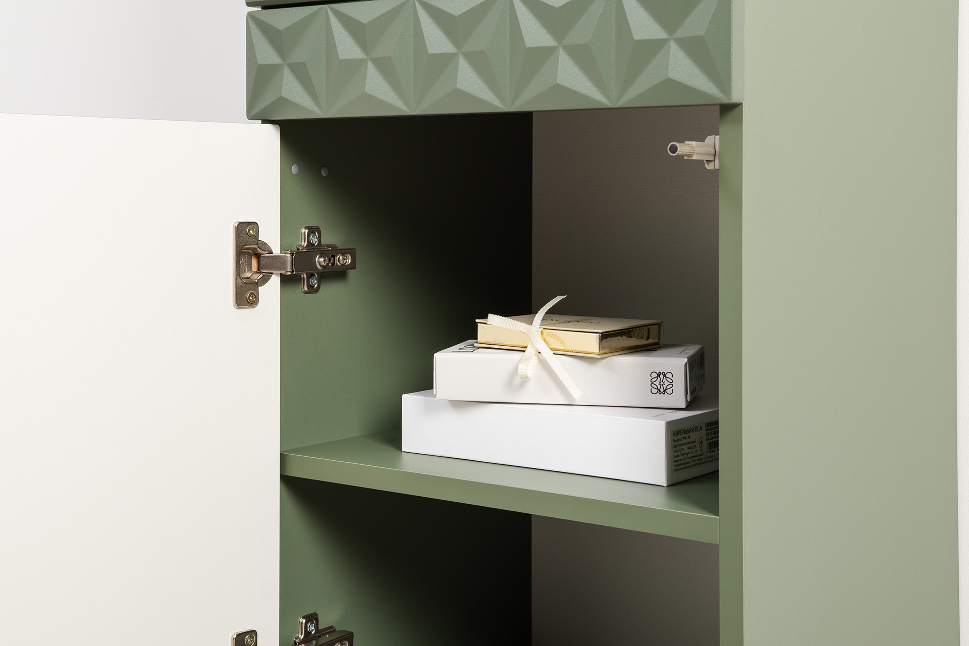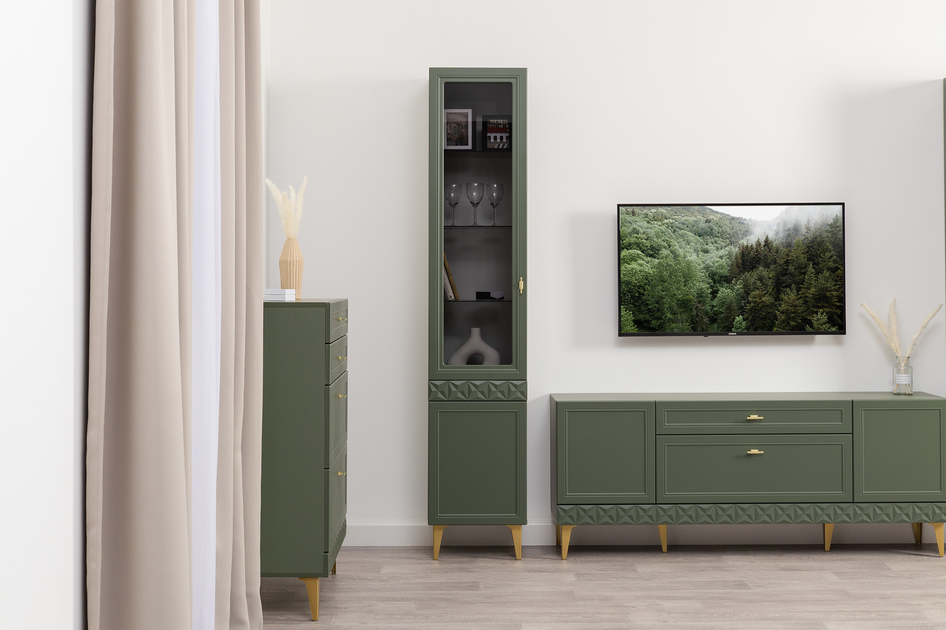 Шкаф-витрина Марион 16.397.01 дымчатый зеленый K521, олива шагрень AG 1050 ПВХ (собирается на любую сторону)