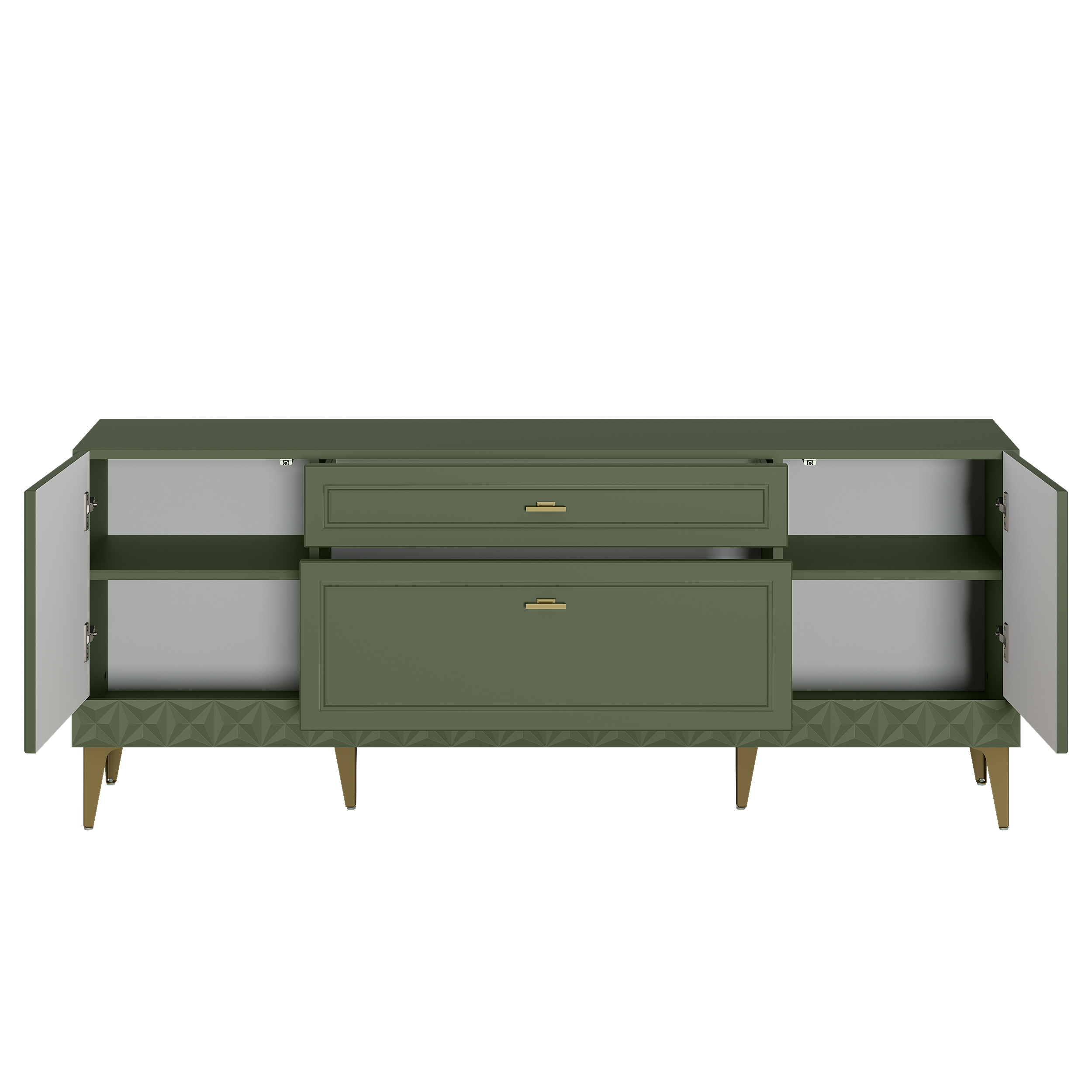 Изящные линии, глубокая фрезеровка фасадов из МДФ и благородные оттенки. Утончённая «Слоновая кость» и изысканная «Олива Шагрень» с глубоким зелёным тоном — создают атмосферу уюта, тепла и благородства. Металлические ручки и опоры золотого цвета придают мебели утончённый блеск, а петли и направляющие с доводчиками обеспечивают плавное и бесшумное закрытие фасадов.