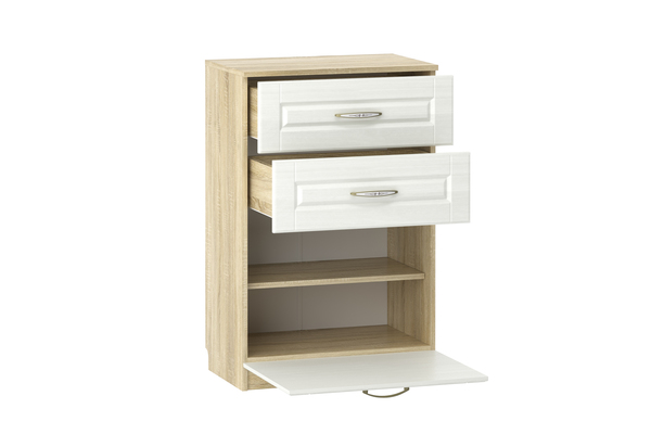 Тумба Оливия НМ 040.45 Х обеспечит аккуратное хранение обуви в прихожей. Для этого лучше всего подойдет нижнее отделение с полкой, скрытое за откидным фасадом. За счет встроенных газлифтов дверца открывается плавно. В верхней части тумба оборудована двумя выдвижными ящиками, в которых можно хранить средства по уходу за обувью, ключи..