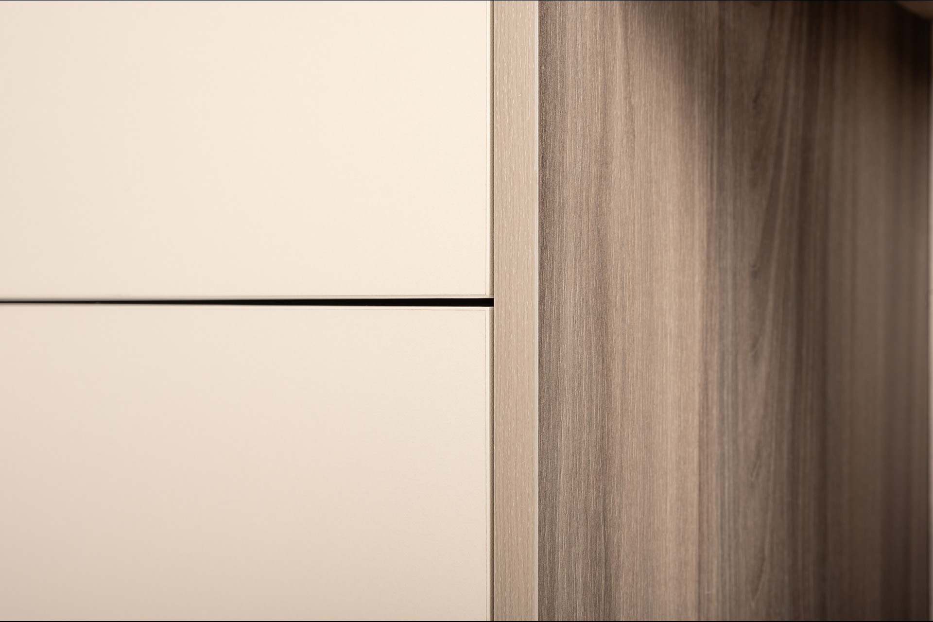 Фасады с механизмом push-to-open, направляющие скрытого монтажа, петли с доводчиками, утолщённая кромка – комфорт продуман до мелочей.