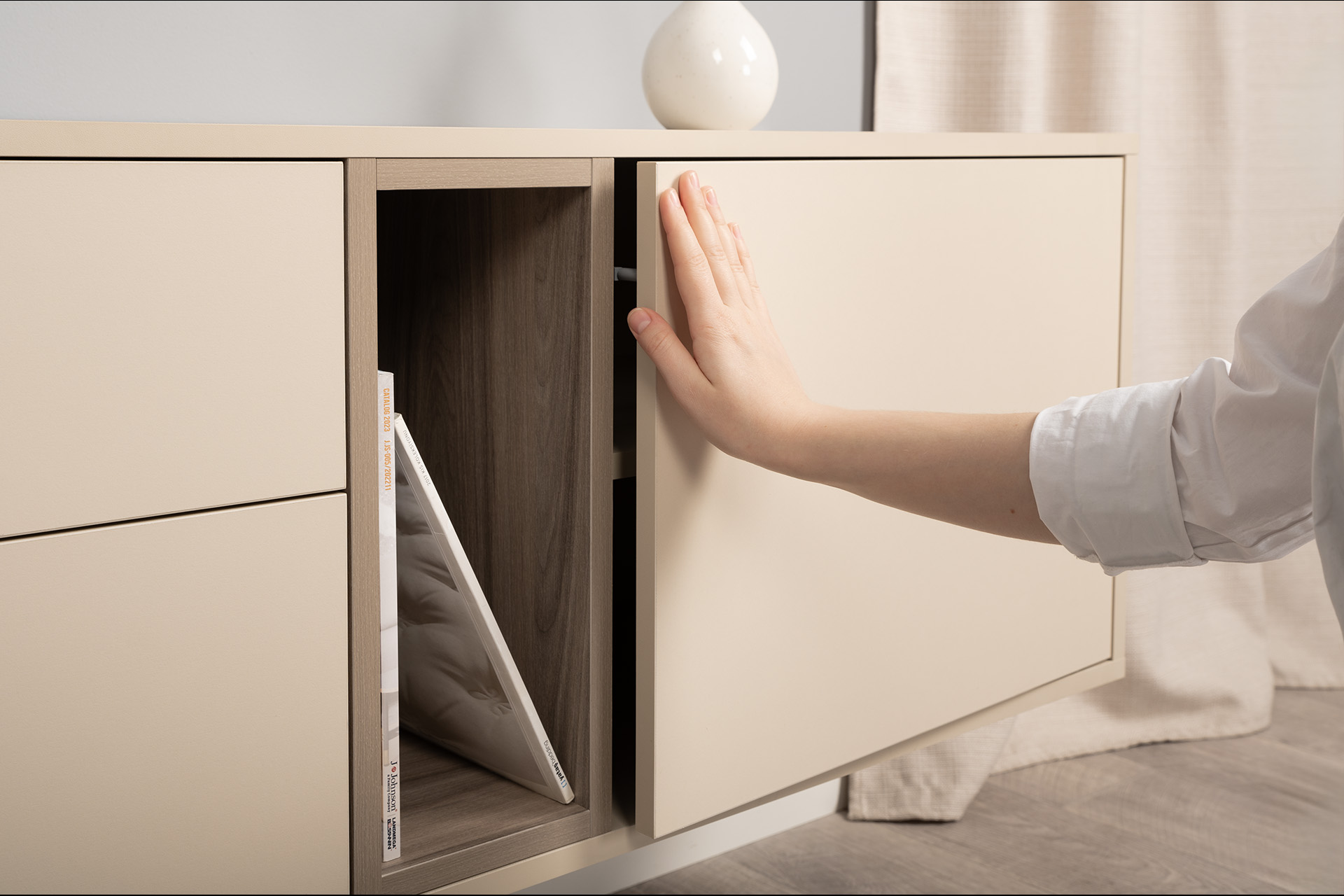 Благодаря нейтральному светлому оттенку и универсальности декора модули можно разместить в спальне, гостиной, прихожей.