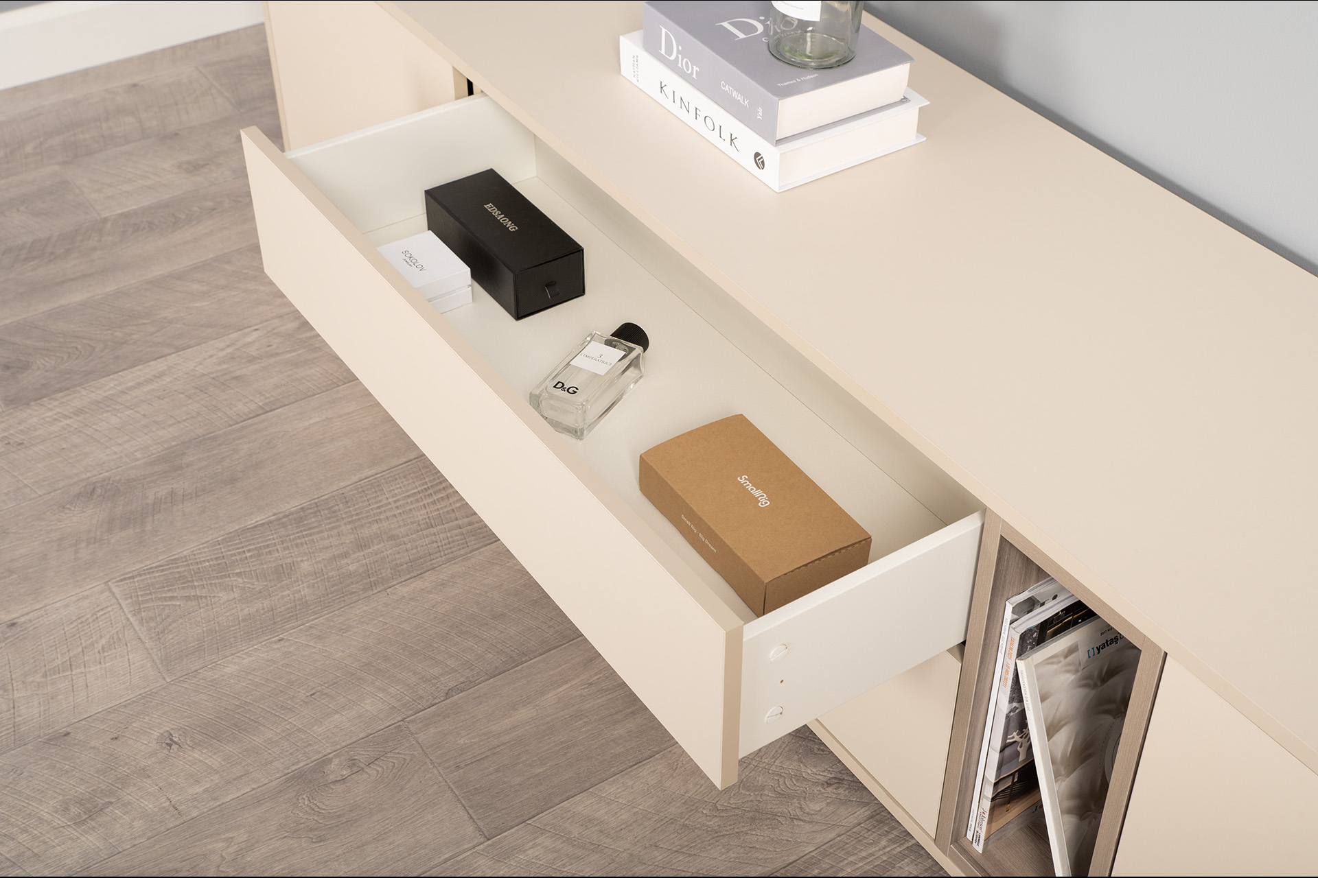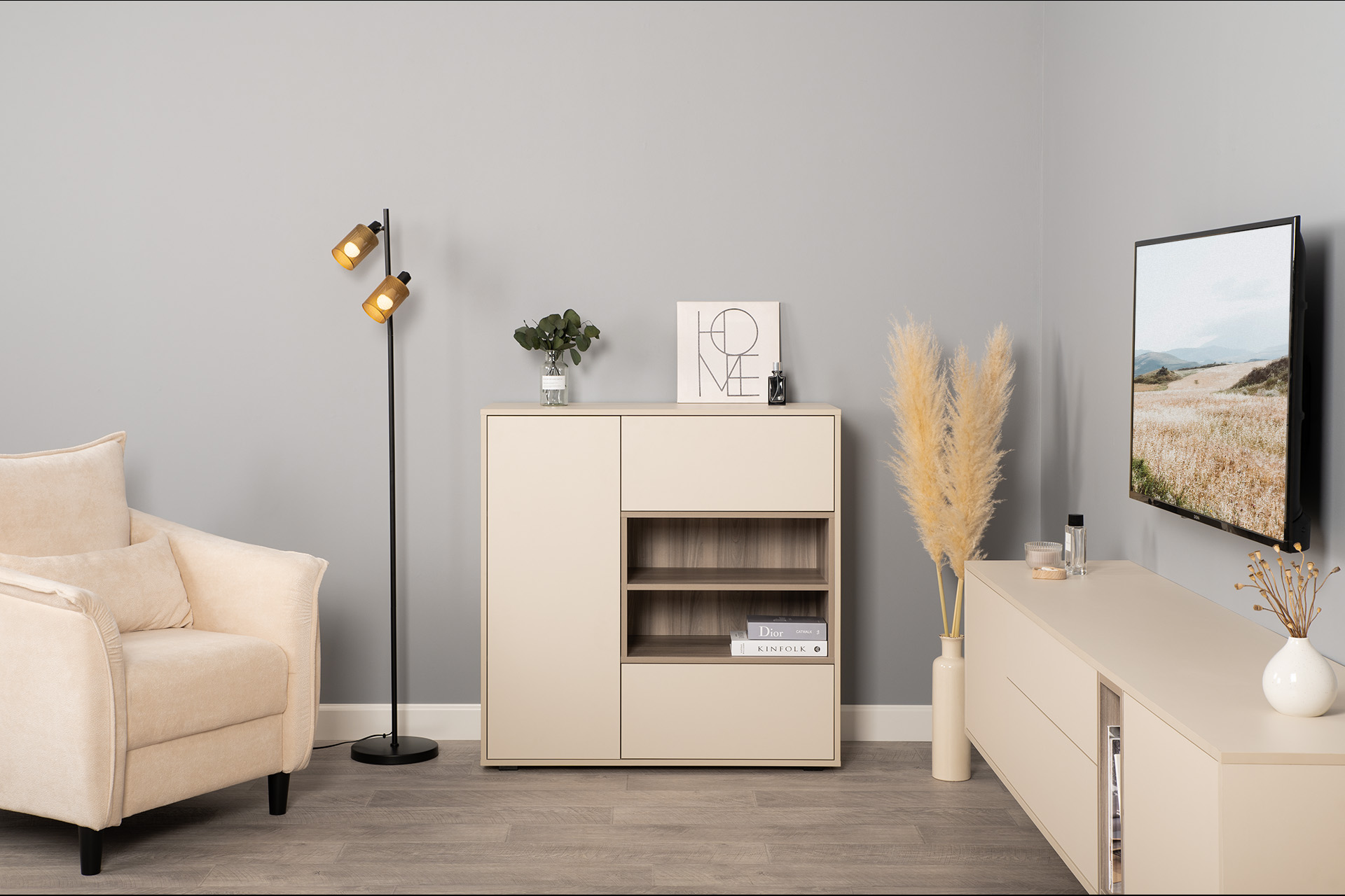 Тумба под ТВ в гостиную Петра 13.281 белый PE шагрень, милк софт ПВХ, бетон чикаго беж ПВХ