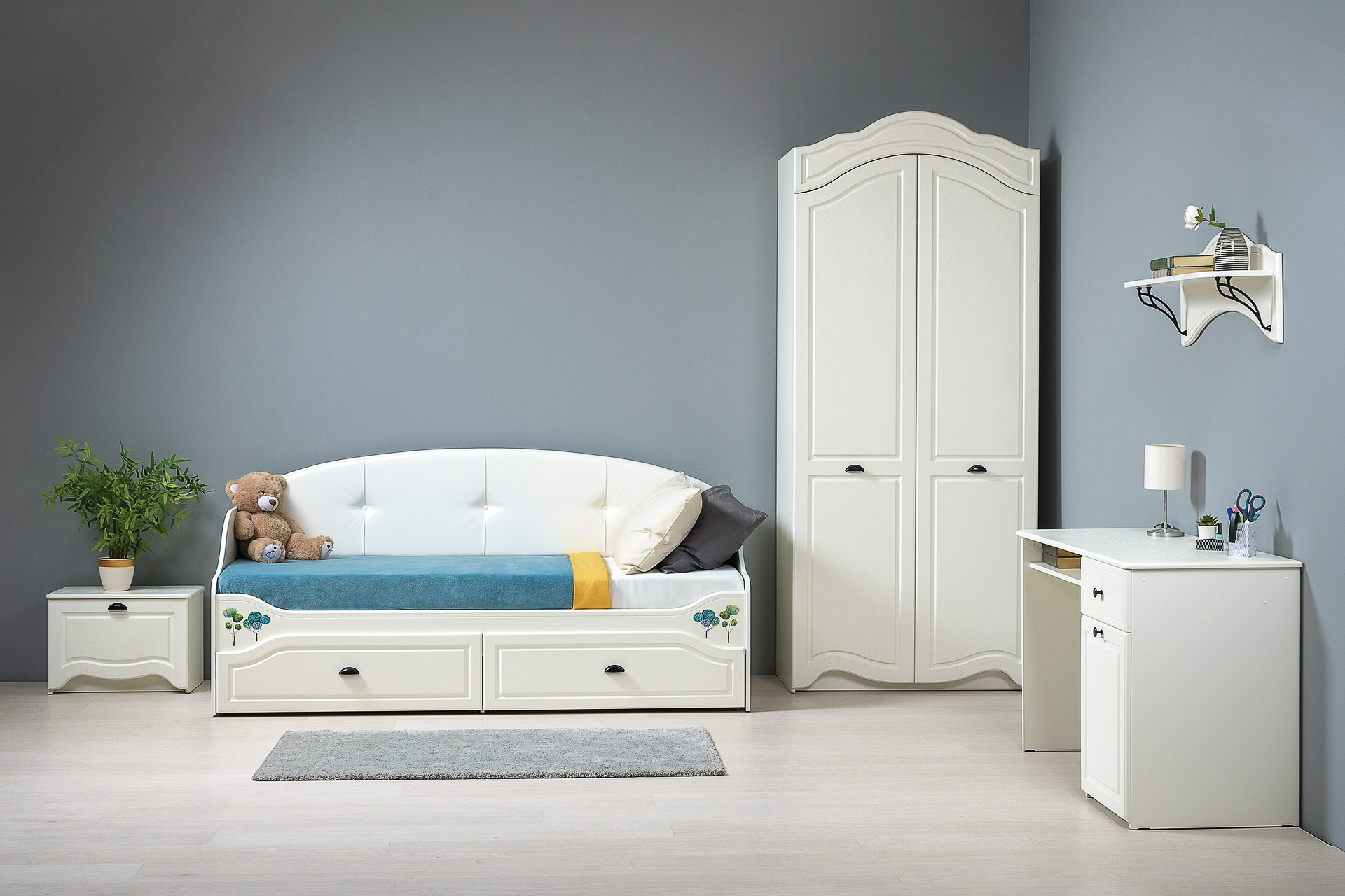 В коллекции Роуз 4 элемента с разным функционалом, которые помогут грамотно сформировать пространство детской комнаты: кровать с большим спальным местом и емкими выкатными ящиками будет шикарно смотреться при любой постановке в интерьере; вместительный комод сможет идеально распределить вещи и игрушки; просторный шкаф сохранит в порядке детский гардероб, а лаконичная, но немаловажная тумбочка отлично дополнит